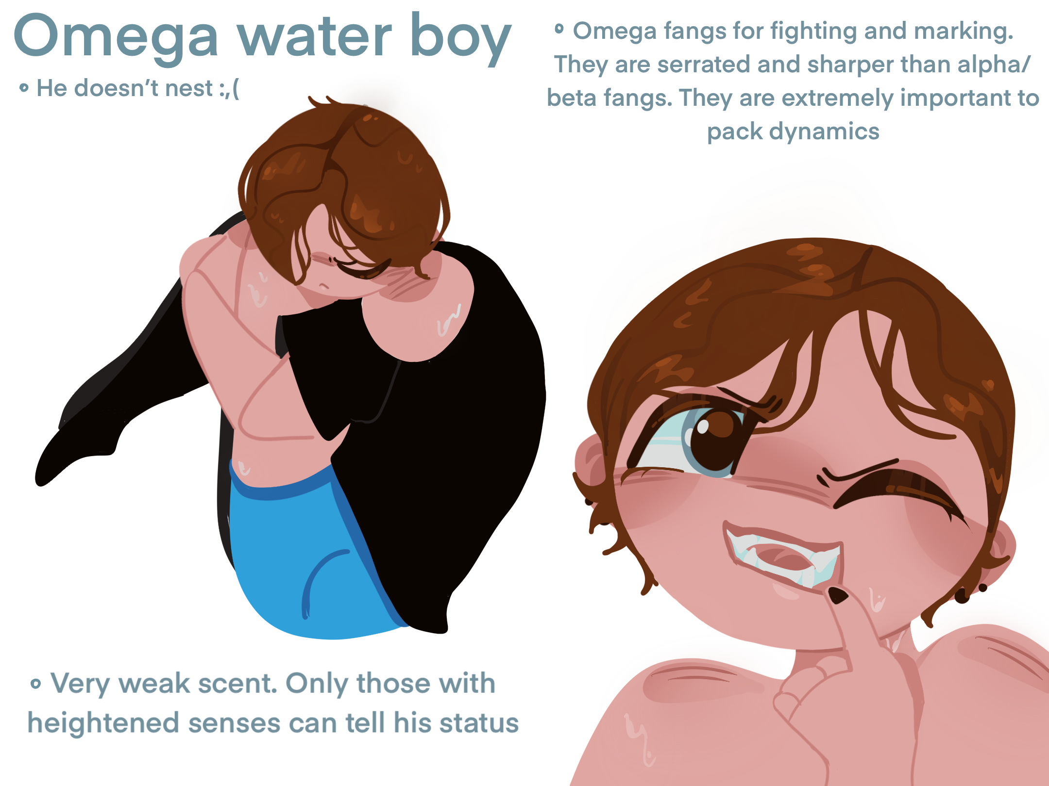 “Isn’t he just a sweetheart, so pretty, honestly, i dont know why your pack lets you out. If you were my omega i’d never let you out of the nest.” He shivered, hair standing on end as the man cooed like he was a child. His face flushed at the teasing, humiliating words. He opened his mouth to try and retort in some way, but the grip on his jaw tightened. Making his jaw crackle uncomfortably as his teeth are shown to the camera. Unable to close his mouth with how harshly his grip was. The man's other hand pulls his top lip upwards, revealing his fangs. A low whine bubbles up from within his throat before he can suppress it. An undeniable omega sound, calling out for ‘pack’. Water dripped down his chin as water escaped from his chest.