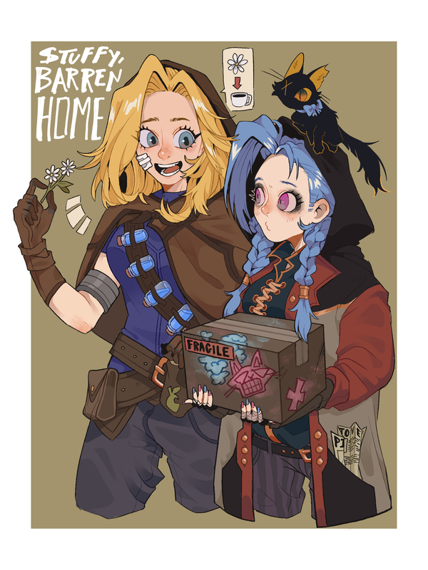 Their walk was silent, letting the busy market fill the stillness between them. Rings of bells and scattered crowds mobbed the sides of the street, letting them peacefully walk with spacious strides. Jinx glanced down at the heavy box, before back at Lux’s pulled hood. She could feel the question eating at her insides, clawing and vying for her attention. She breaks.