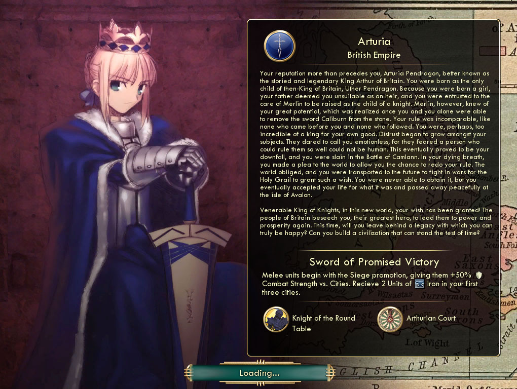 The Once and Future King: Civilization V Addition is a mix of both an in-character let's play and it's own crossover story based from the events of the game. The game itself is a single player and heavily modded rendition of Civilization V. It's a fairly standard eight player setup, with all Civilizations as fictional groups modded into the game. It starts in the ancient era on a continent's map with fairly standard settings on the Prince difficulty. There are several additional mods effecting art, minor gameplay mechanics, city states, and religious terminology. As a result I claim only the OC standing in as Arturia's new Master as my own design. While as thanks to a certain group inspiring me to start and keep this project going there will be a shout out or two.