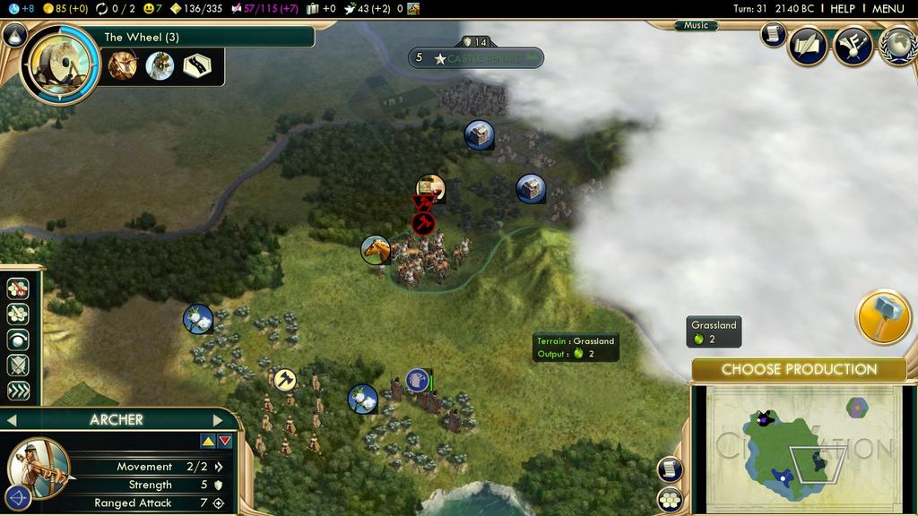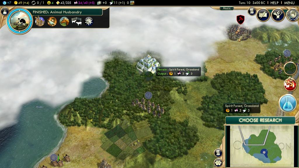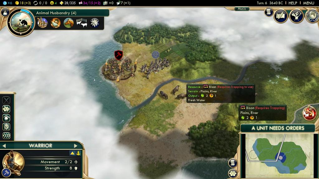 After quelling the barbarian encampment, both the archer and scouting units responsible continue tracing the forests along the western coast. They chart a course northward. The ancient architecture and oddly silent central forest they’ve found merits interest. Perhaps it could be studied? Some of my people claim it to be a holy site… Later, perhaps. The archers will break off to join the subjugation of the nearby savages with a troop of warriors. The scouts continue northward for now as I must know the shape of this landmass and who else inhabits it. On a side note, I believe Britain's knowledge of animals has reached the point that we may begins stabling horses and livestock.