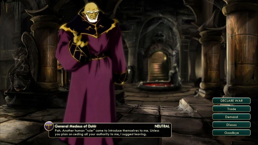 Medeus: That is a valid question for my empire is foreign to these lands. Humans… through malice or incompetence have proven themselves incapable of governing even the simplest tribes; or treating other races as anything better than expendable cattle. Humankind shall be brought to heel and educated by their betters. Perhaps after I have taught them firsthand what crimes humans have persecuted against my people.