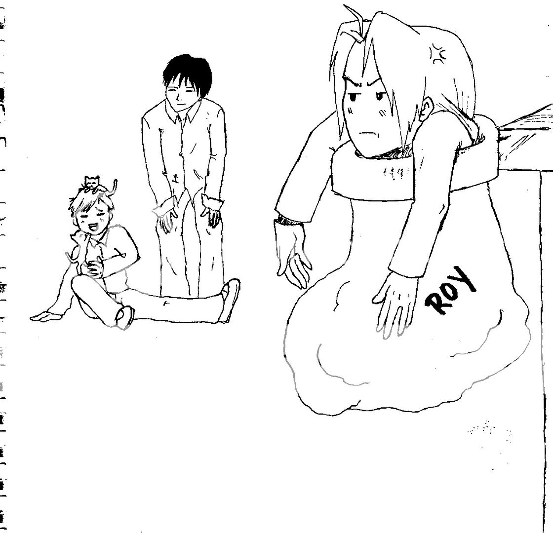 As Roy ticked off the items, Ed's face paled. "Ah, shit," he managed before rushing out the door. Mustang only smirked to himself, knowing he'd have time to put his plan to action while Ed spent the remainder of the business hours squandering the rest of his cenz on cat supplies.