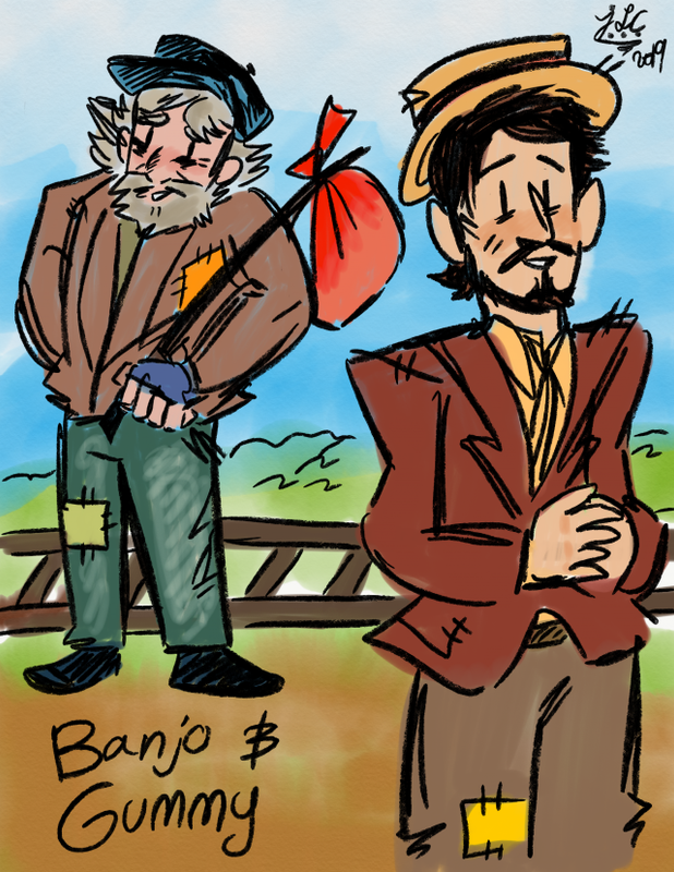 Narrator: “So as that chuggin’ locomotive sighs and whistles from another town’s adventure we bid a weary fare-thee-well to our wayfaring lovers. Perhaps happily ever after is in the eye of the beholder for while Banjo and Gummy won’t find the hobo princess afterall they found something greater still and will forever continue their journey, down in Moonshine Holler.”
