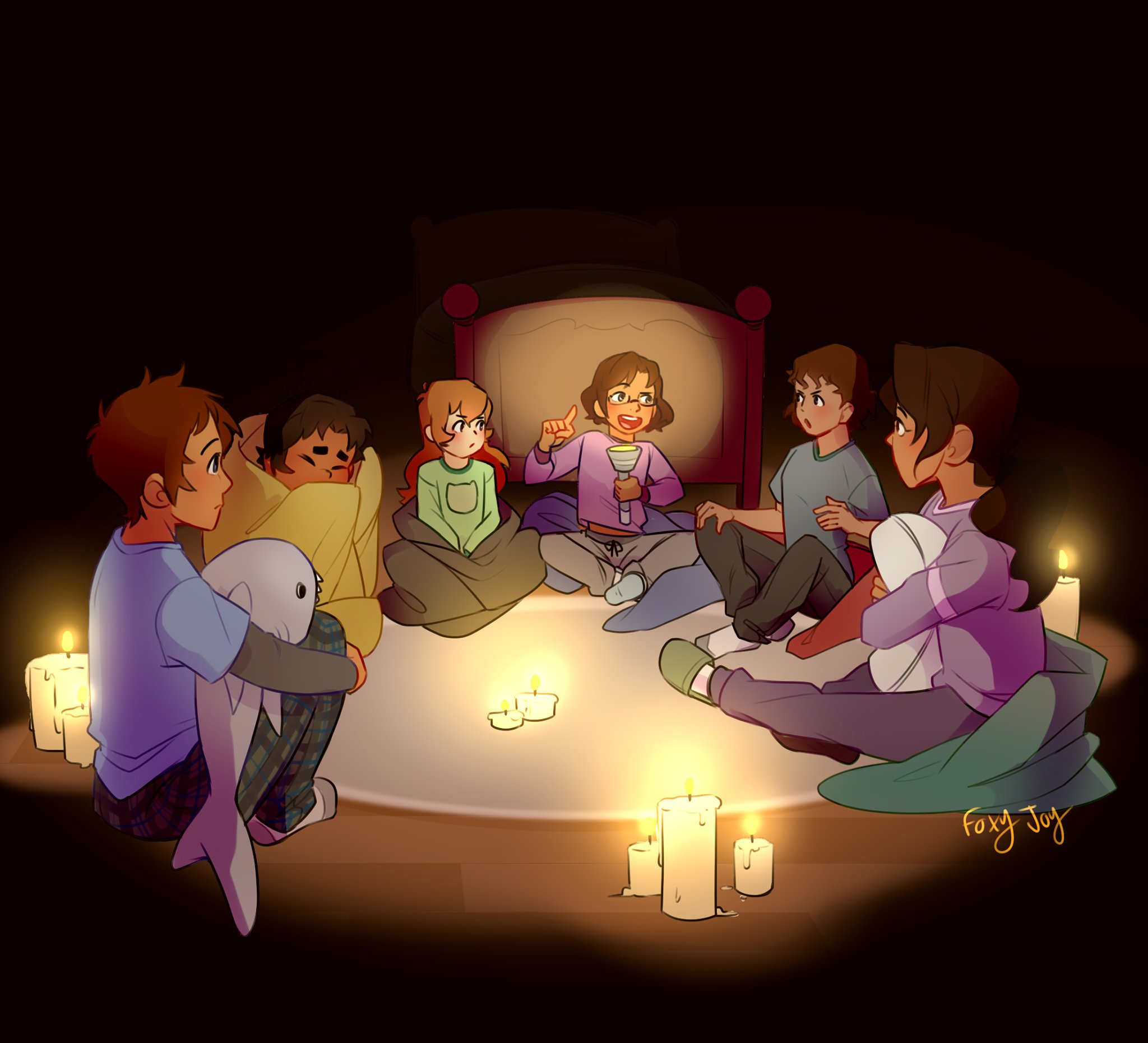 Hunk whimpered from behind Lance, somewhere buried within the linens. “I’m sure we’re good for tonight right guys?” came his muffled request, at which Lance shot him an unhelpful glare and Pidge executed a much more successful elbow drop into an unknown part of her larger friend, eliciting a muted “ow” from within the plush cocoon. His head came free of the layers, “Come on guys enough scary stories for tonight please”