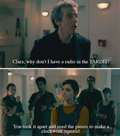 As she pondered the question, slowly closing the door — before her face melted off and she became a recurring monster, not an experience she wanted to repeat — the clockwork squirrel on the top shelf decided to attempt a can-can. Ascertaining the motivations of a clockwork squirrel is a fool’s errand, but it’s possible that it was a vain attempt at gaining its creator’s attention (a goal it would achieve out of all proportion). It had been relegated to the top shelf by the Doctor after she got cross with it one day for getting fresh with the toaster, and it had become very bored and rather dusty sitting there. The relegation had happened before Missy had entered the scene, and whether a semi-sentient clockwork squirrel fitted into her enigmatic plans, or whether she just couldn’t be bothered to move it, no one would ever find out. All that matters for the current development of things is that it toppled over the edge and hit the Doctor squarely on the head. As she scrambled for purchase she sent one of the jars flying, and — clearly not wanting to be alone in its sudden battle with gravity — it made sure to send every other jar flying with it on its way down.