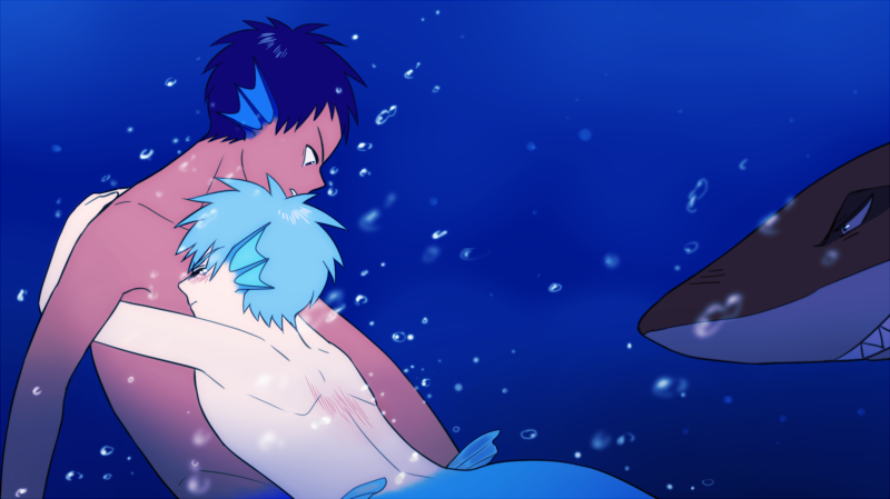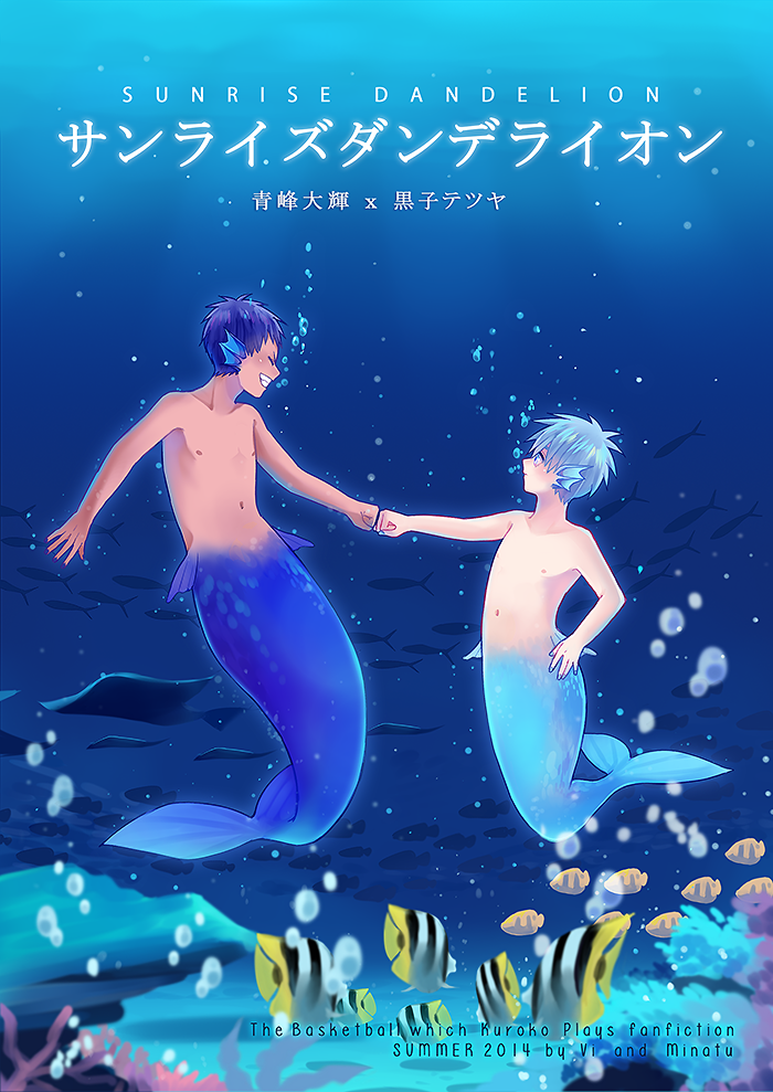 "Don't cry…" Aomine instinctively embraced the pale merman and pressed Kuroko's head to his chest as he glared menacingly at the sharks that were preparing to launch their next attack. The other merman was trembling in his arms. "I'll get us out of here, okay? Cover your ears."