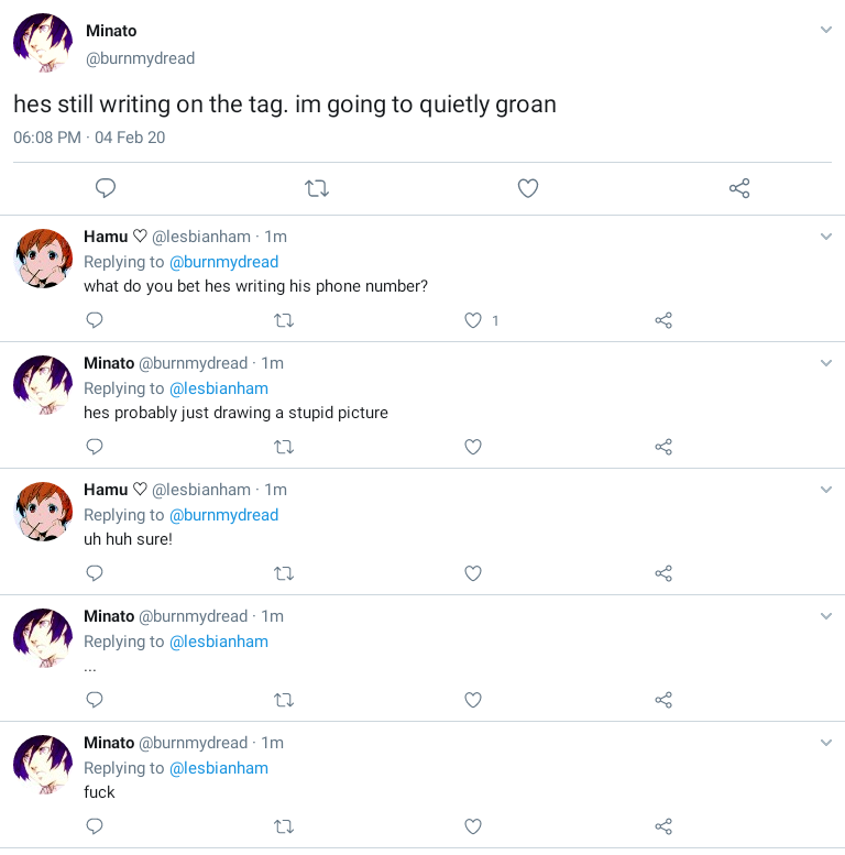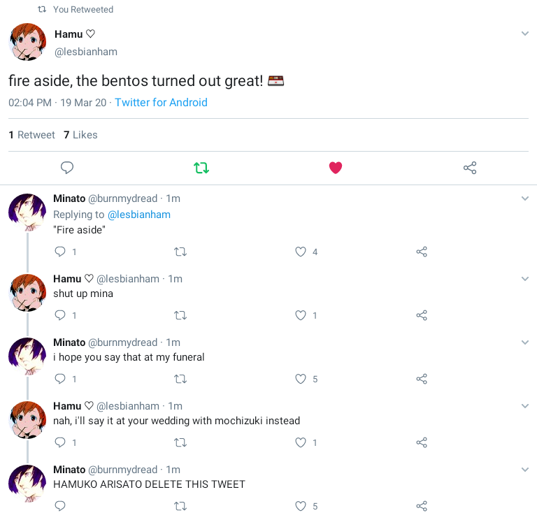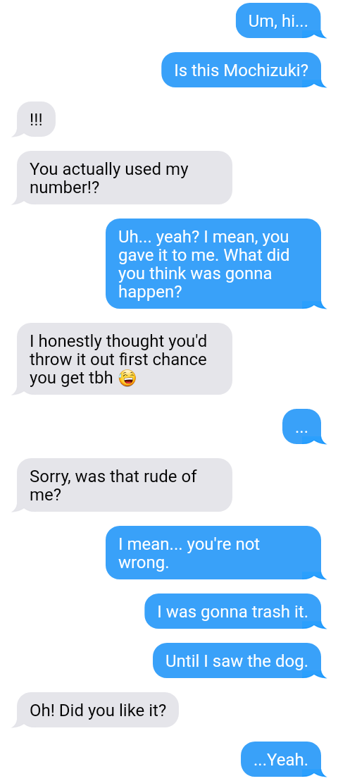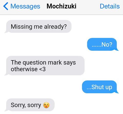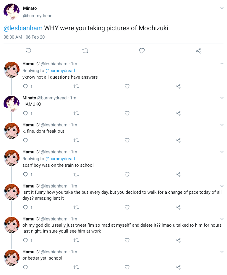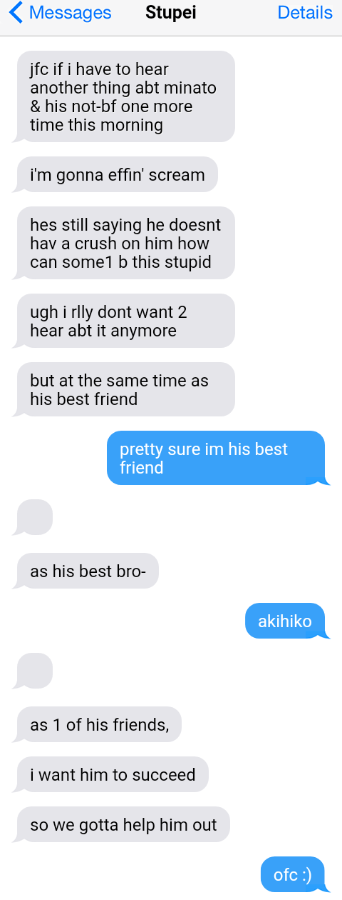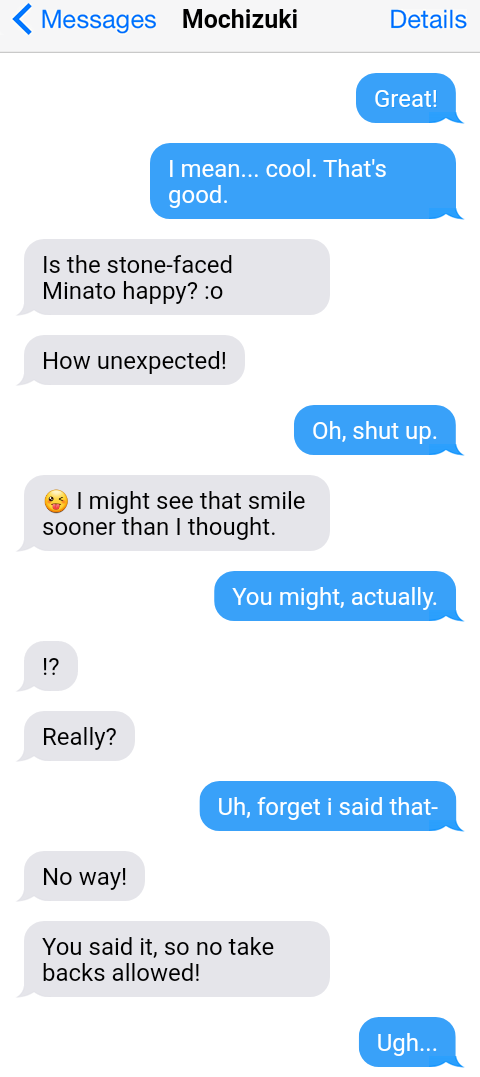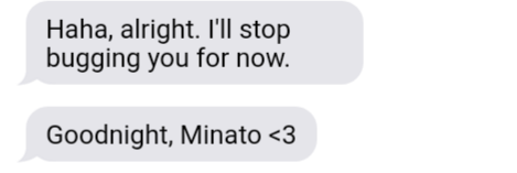 Minato and Ryoji continue to flirt with each other through text while remaining oblivious to the other's pining. Everyone is tired