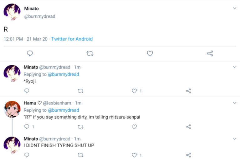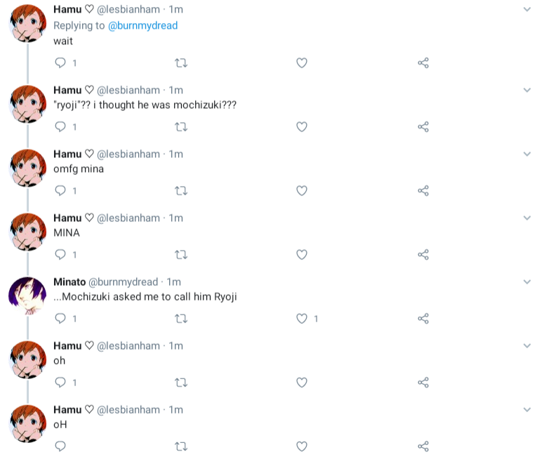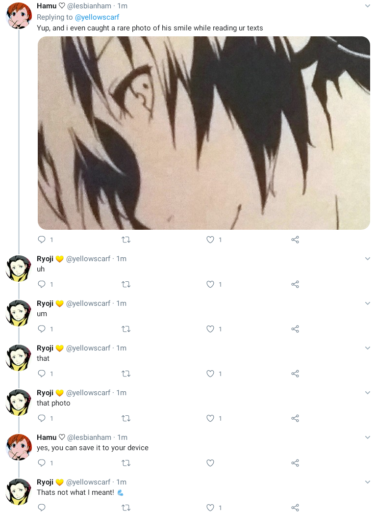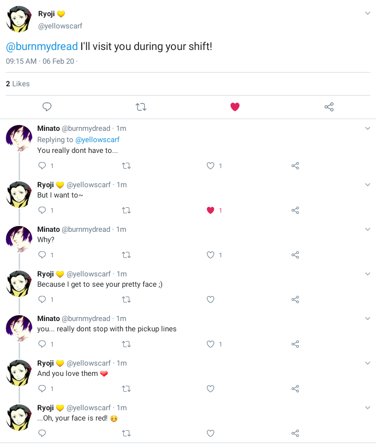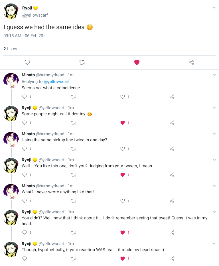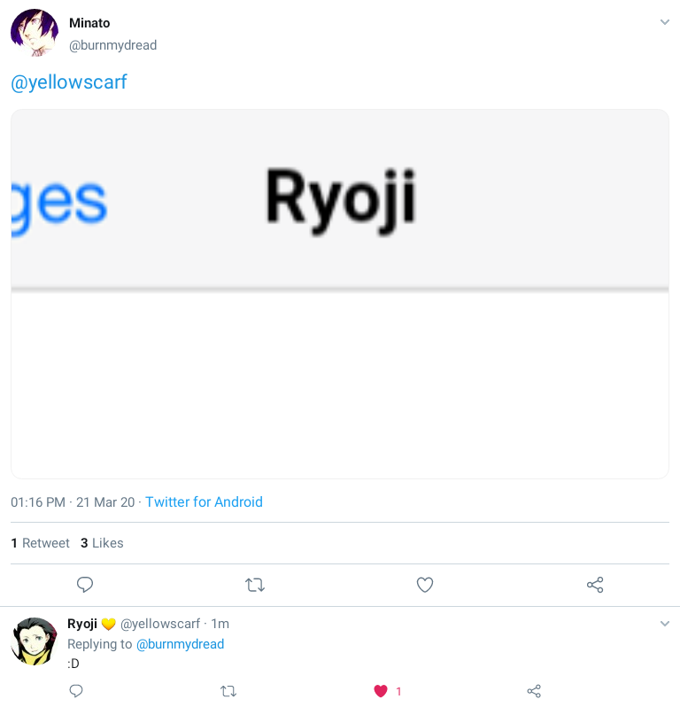 - Ryoji doesn't post much on priv, and mainly made the account to pine over Minato (without Minato seeing it).