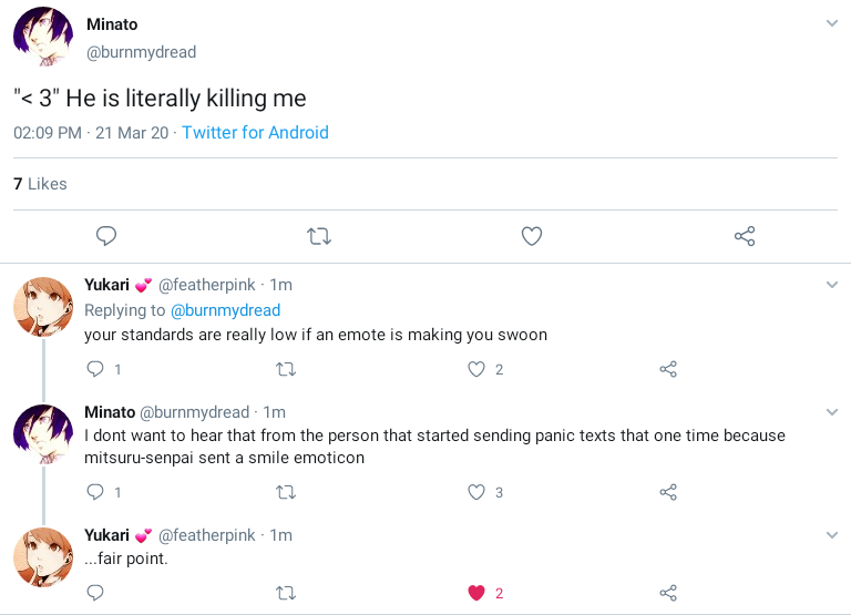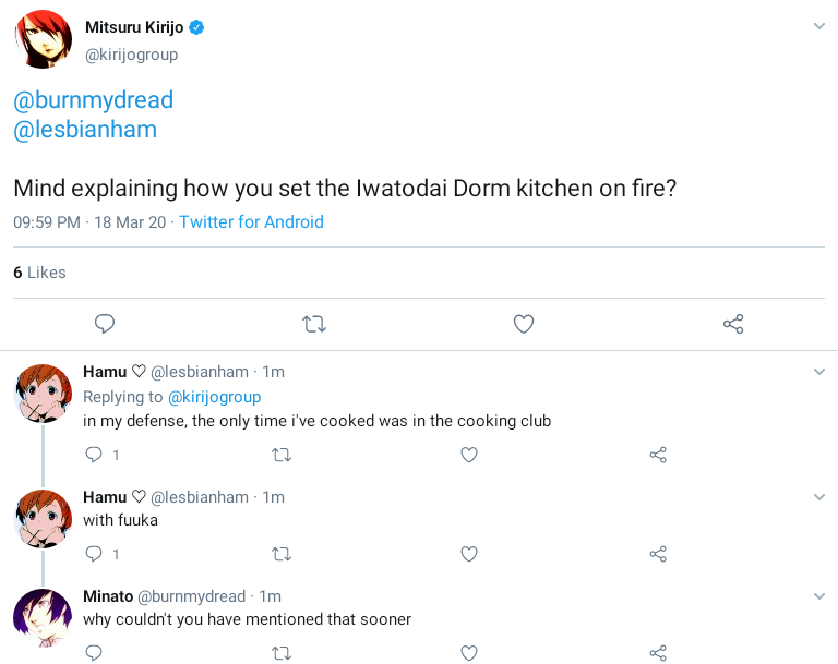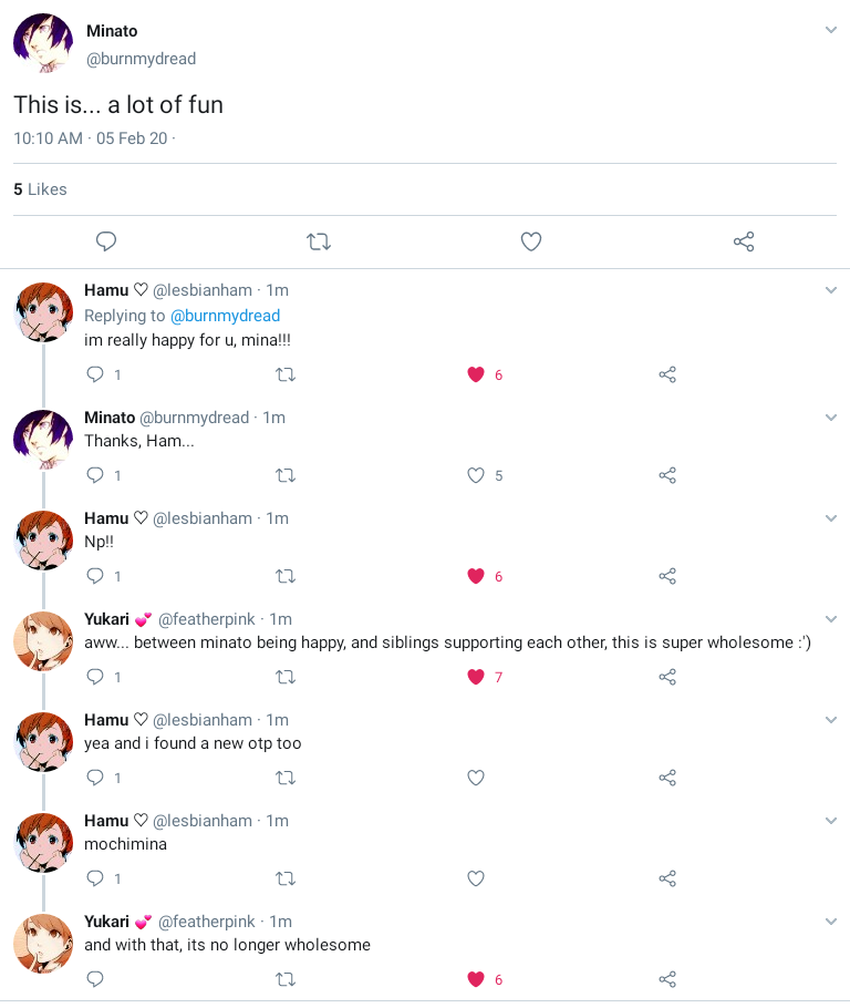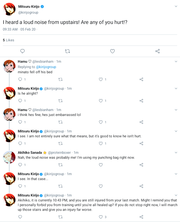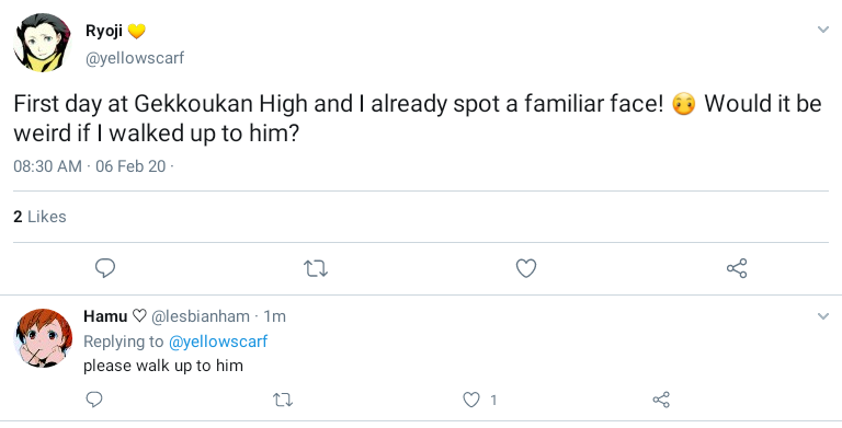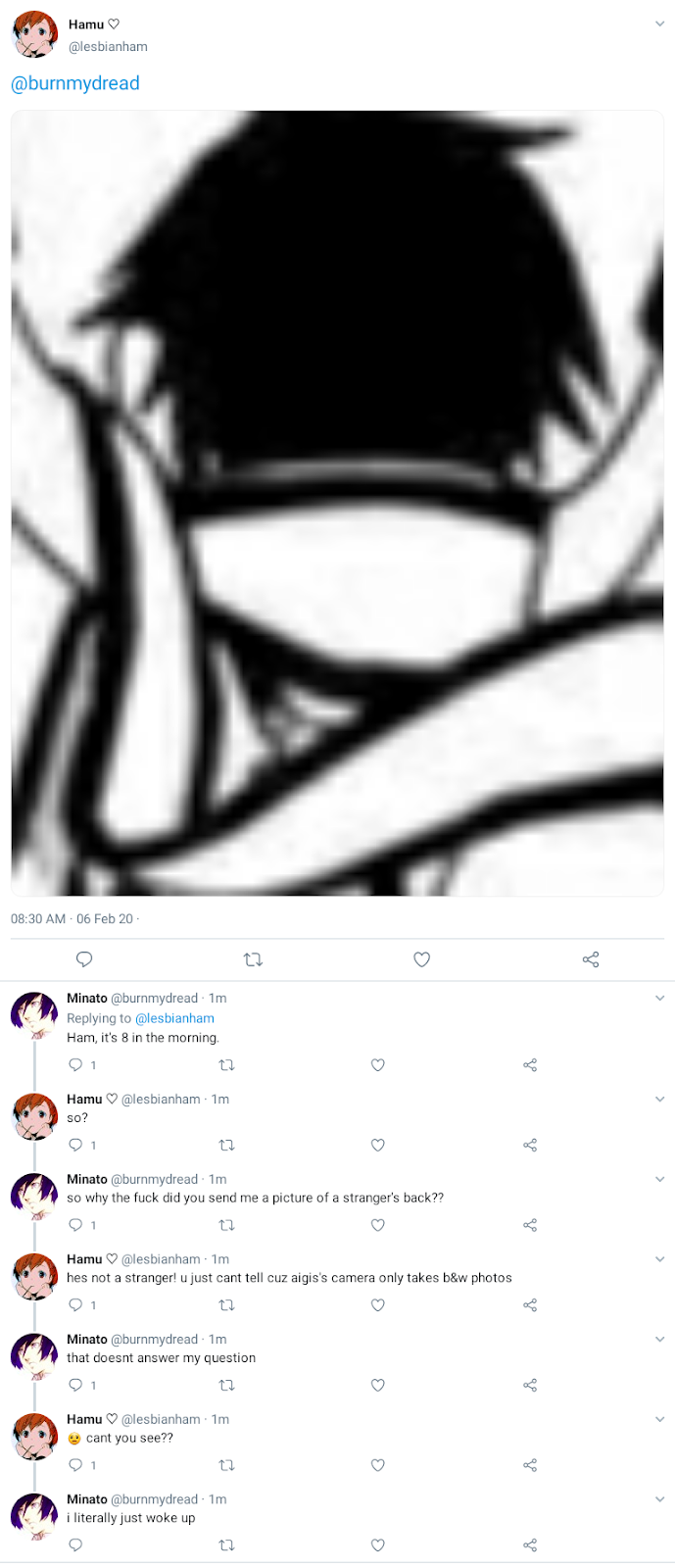 Uhh first off, i'd like to apologize for the extremely long hiatus! i originally had several chapters ready to post last year but the app i was using got removed from my device (and the play store) so that was fun. i ended up losing motivation after that, which was why i stopped updating the fic entirely. (also got into new fandoms but thats not important) anyway i logged onto a03 for the first time in a year and saw many comments, kudos, and recs from everyone who was reading the p3 socmed au! thank you so much!! your support really means so much to me and i was incredibly motivated by the kind words i received, laughter from people who enjoyed it, and comments waiting for the next chapter. this is quite honestly the most self-indulgent thing i've ever made so seeing that it had become so loved was incredibly surprising and very touching! most of you have probably left/or unsubcribed (and rightfully so, i left for an entire year-) but if you haven't... thank you very much for waiting this long ❤