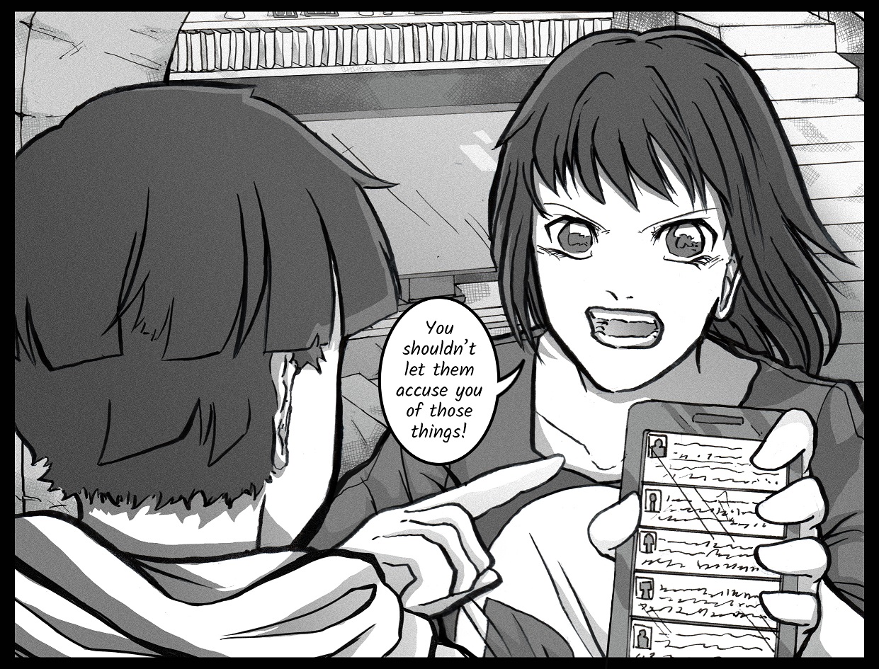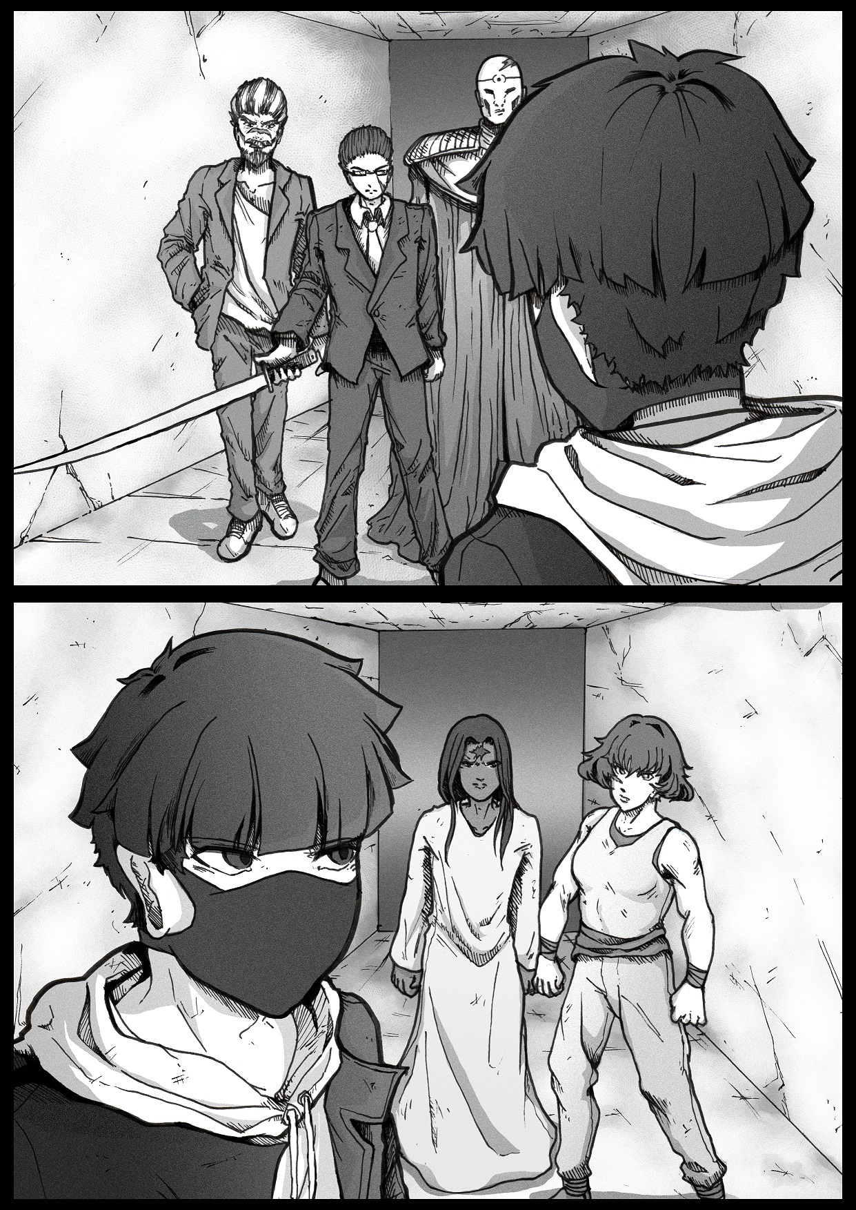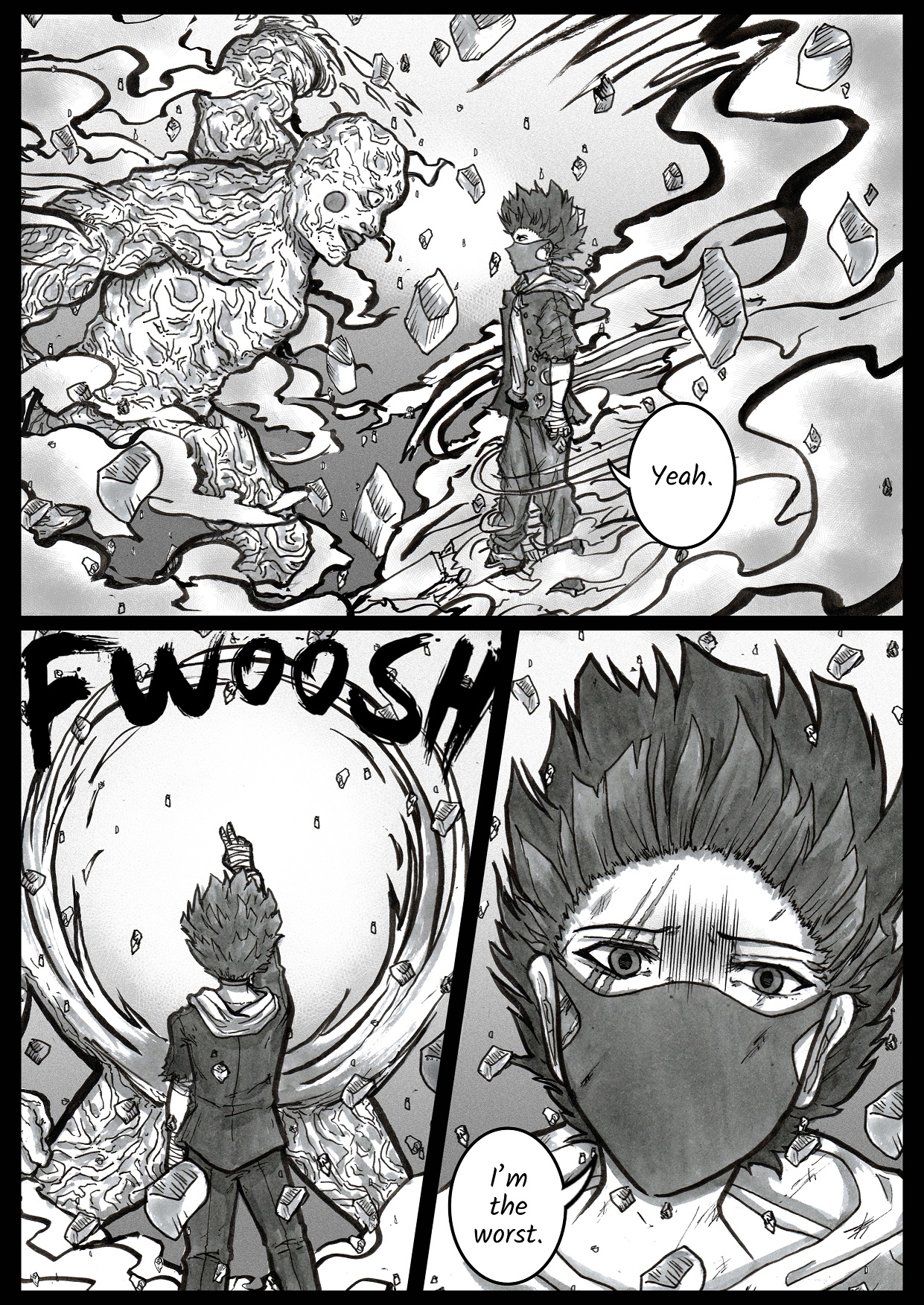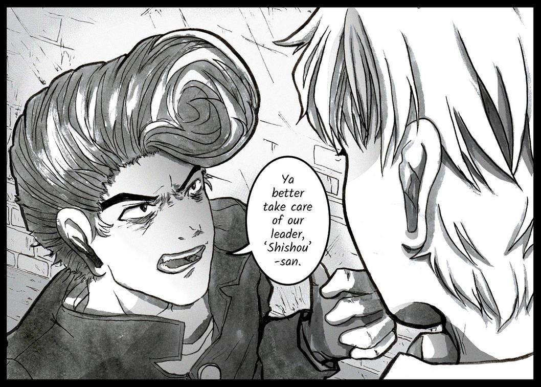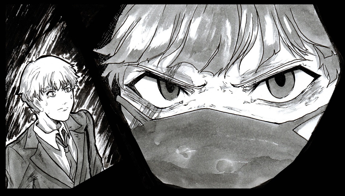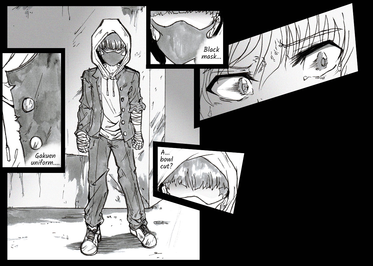 Still, there’s hearing it once and hearing it over a hundred times over. You get a little desensitized after a while. So he really isn’t expecting it when he walks into an abandoned building and sees a figure with a black mask, a hoodie in a beat-up gakuen uniform, and a bowl-cut, of all things.
