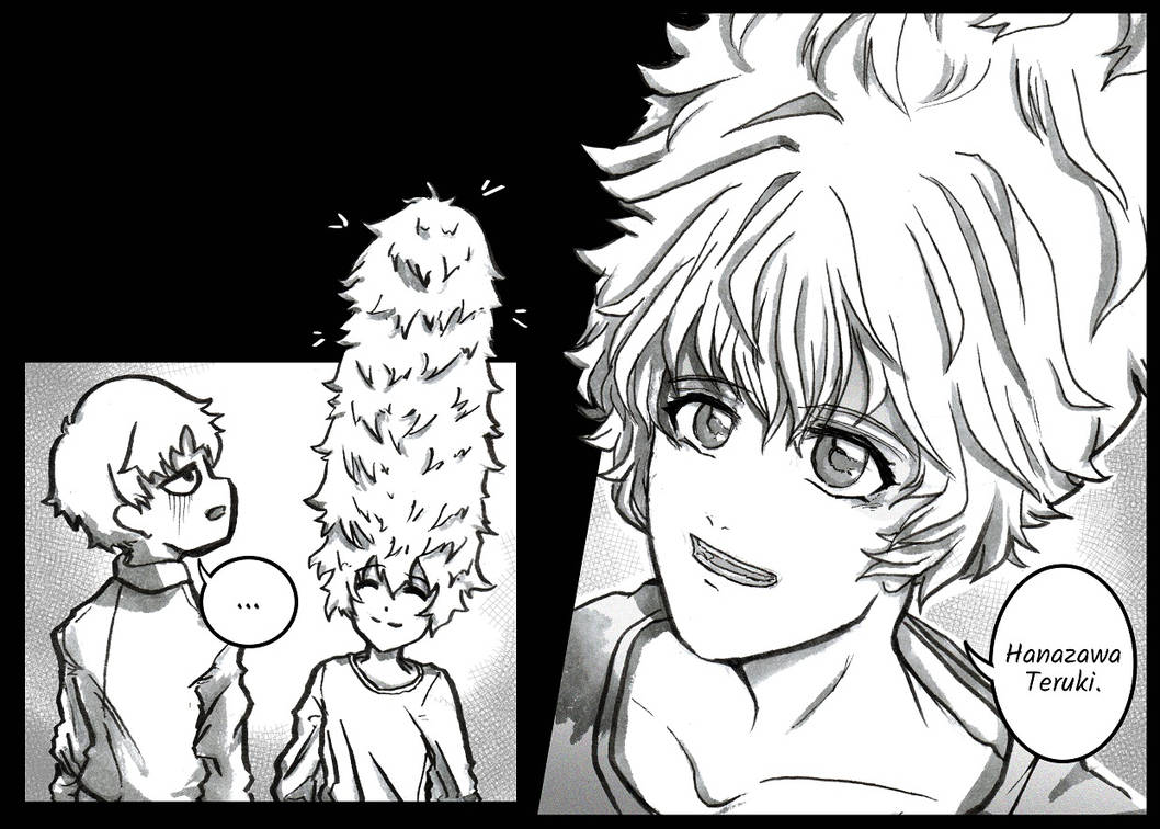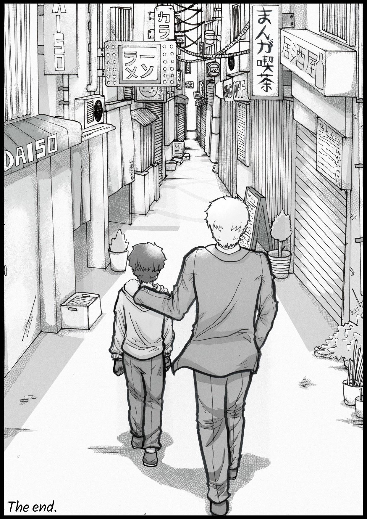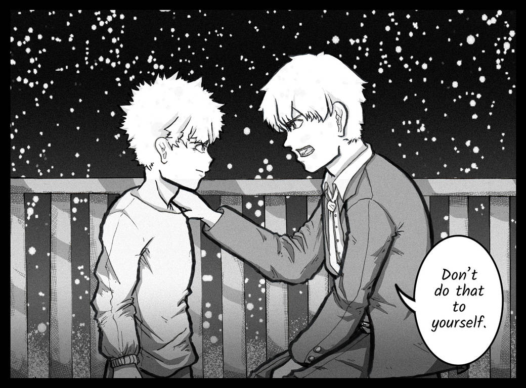 Pressure on his head makes him blink. He looks up to find Reigen’s hand ruffling his hair, only to pause. “Yikes you’re sweaty. Go get a shower Mob, it’s late.”