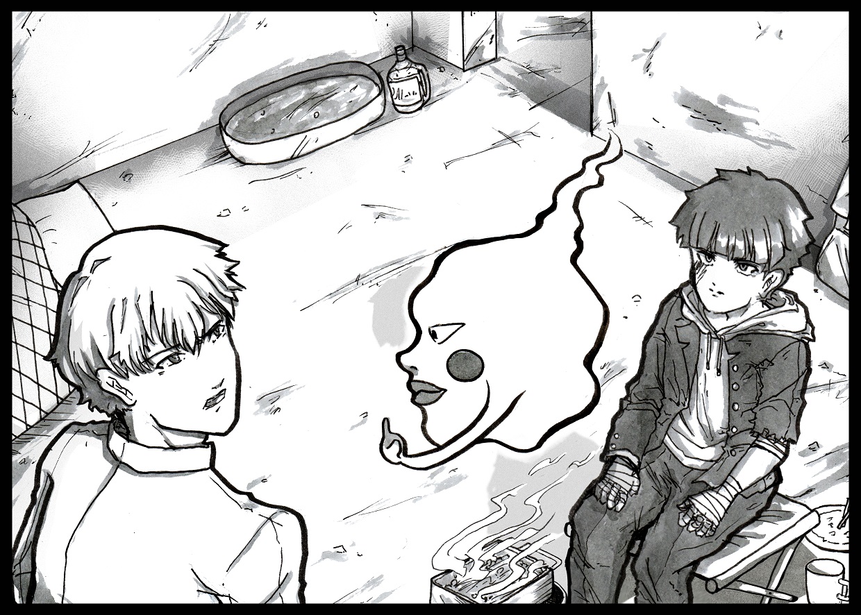 They’re finally, finally set down on the ground and Reigen could have kissed the dirt right then and there if he didn’t feel like he was standing next to a sparking live wire. They were in a different abandoned building, one he’d seen maybe once while walking to a client’s place across the city. It’s barren, so he’s slightly surprised when Poison crushes a wall and there’s a whole stash of supplies hidden inside.