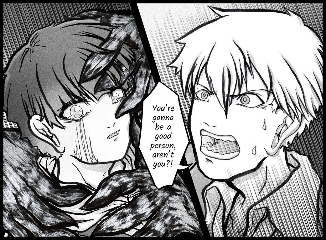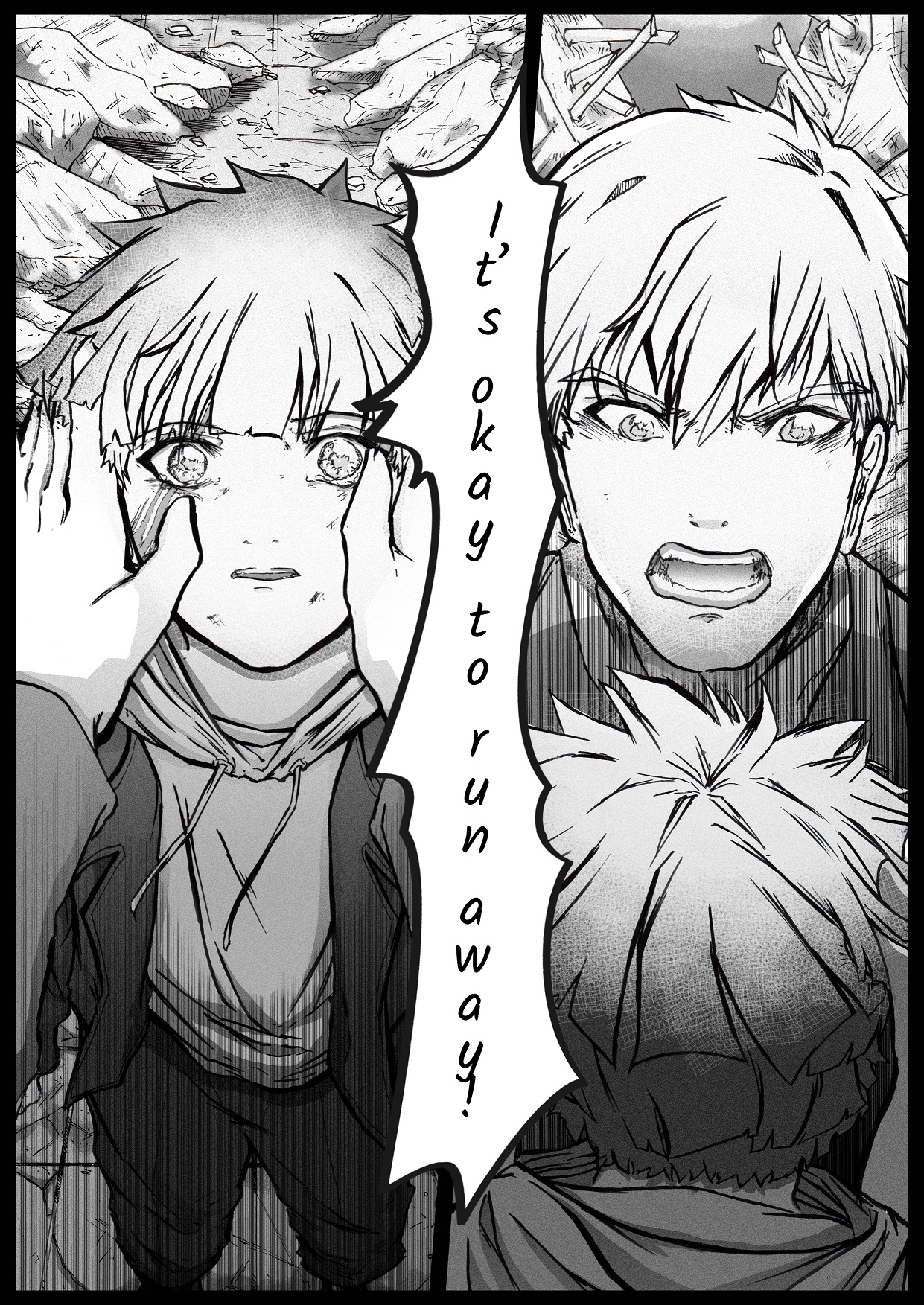 The arm around him tightens. It’s warm. He doesn’t deserve it. It’s so warm.