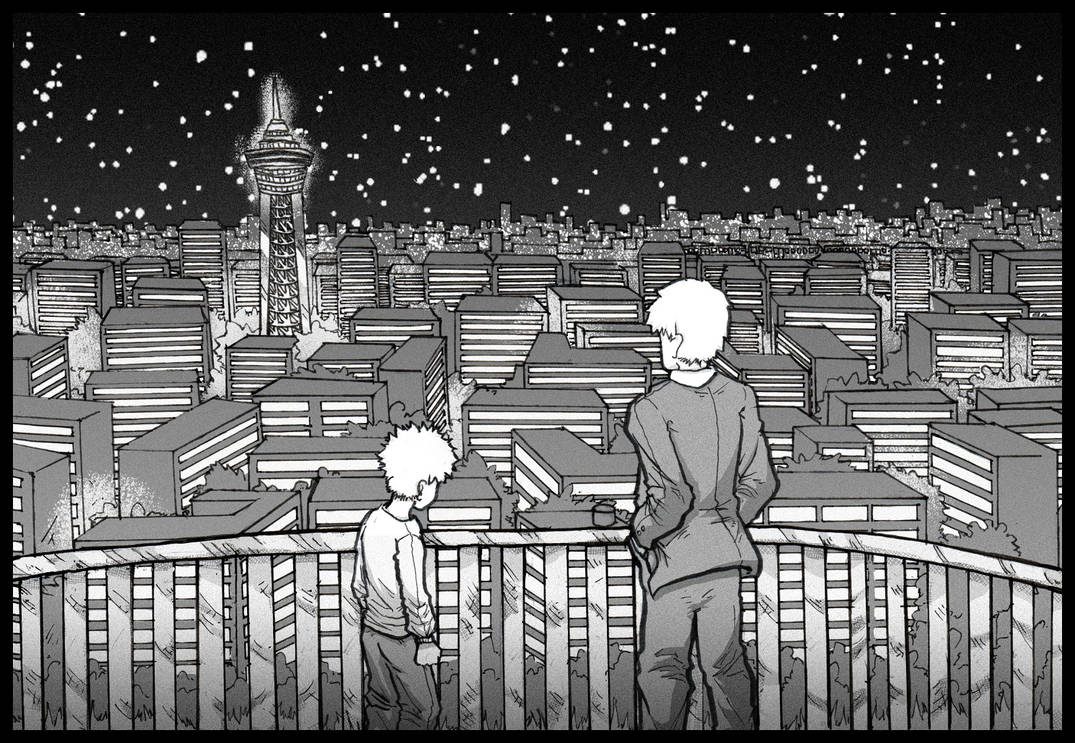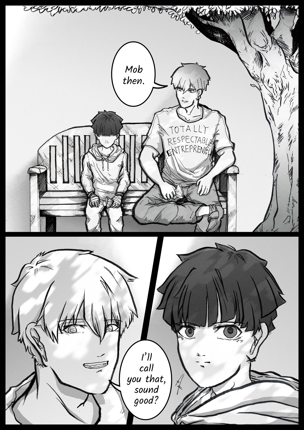 The sound of shuffling clothes and a weight on his shoulder breaks his reverie. Reigen doesn’t speak, just keeps his hand there to anchor him down.