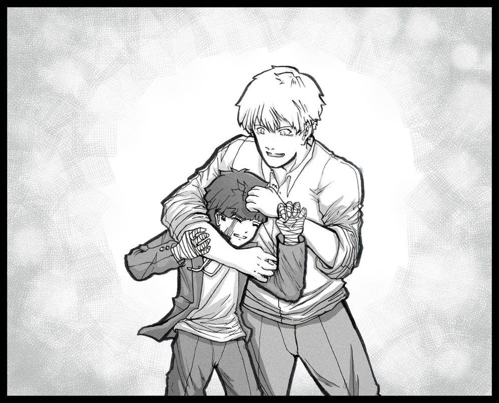 Poison’s still staring at him, his grip doesn’t tighten, but it doesn’t loosen either. Reigen’s suddenly aware that he’s actually floating because if Poison was holding him around his neck he definitely should still be choking right now.