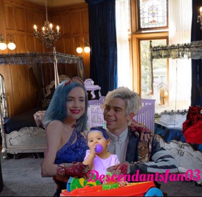 Doug was sitting in his car waiting for Evie to come back. He was starting to worry that something happened because she was supposed to go really quickly and check on Mal and Ben's date and come right back. That was almost thirty minutes ago. His worryful thoughts were stopped as soon as he saw her, but she wasn't alone. Ben was with her, but even more shocking was the fact that Mal wasn't with them, but instead Evie was holding a sleeping tiny blue haired baby.