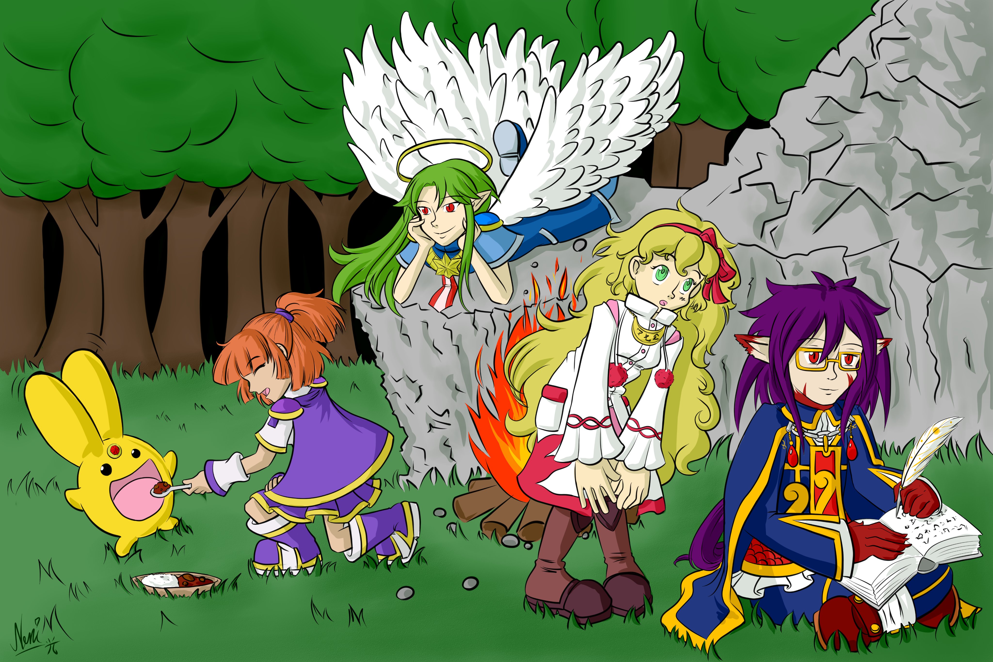 Right, the situation right now was that a lot of people he knew where gathered here in the plaza close to his house, fighting. However, they weren’t battling one another, but rather appeared to be working together, uniting their powers. He saw Amitie, Arle, Klug, Raffina, Rulue, even Schezo and the Dark Prince, Satan, were helping. And then there was the person they all were fighting. A lone girl dressed in red, standing further back.