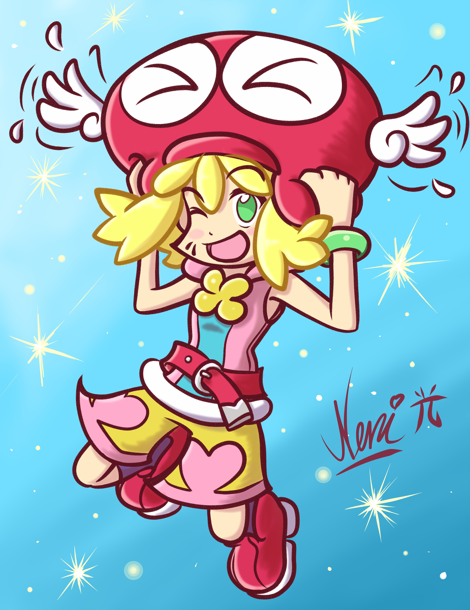 Everyone was shocked to watch a whole cascade of golden blonde hair spill out from underneath the red Puyo hat as it left Amitie’s head. The long locks flowed down on all sides, pouring over her back, her shoulders and even her face. Amitie flailed around, not having expected to be suddenly robbed of her sight like this. Hurriedly, she grabbed on to her hair with both hands and pulled it aside like curtains so that her face became visible again.