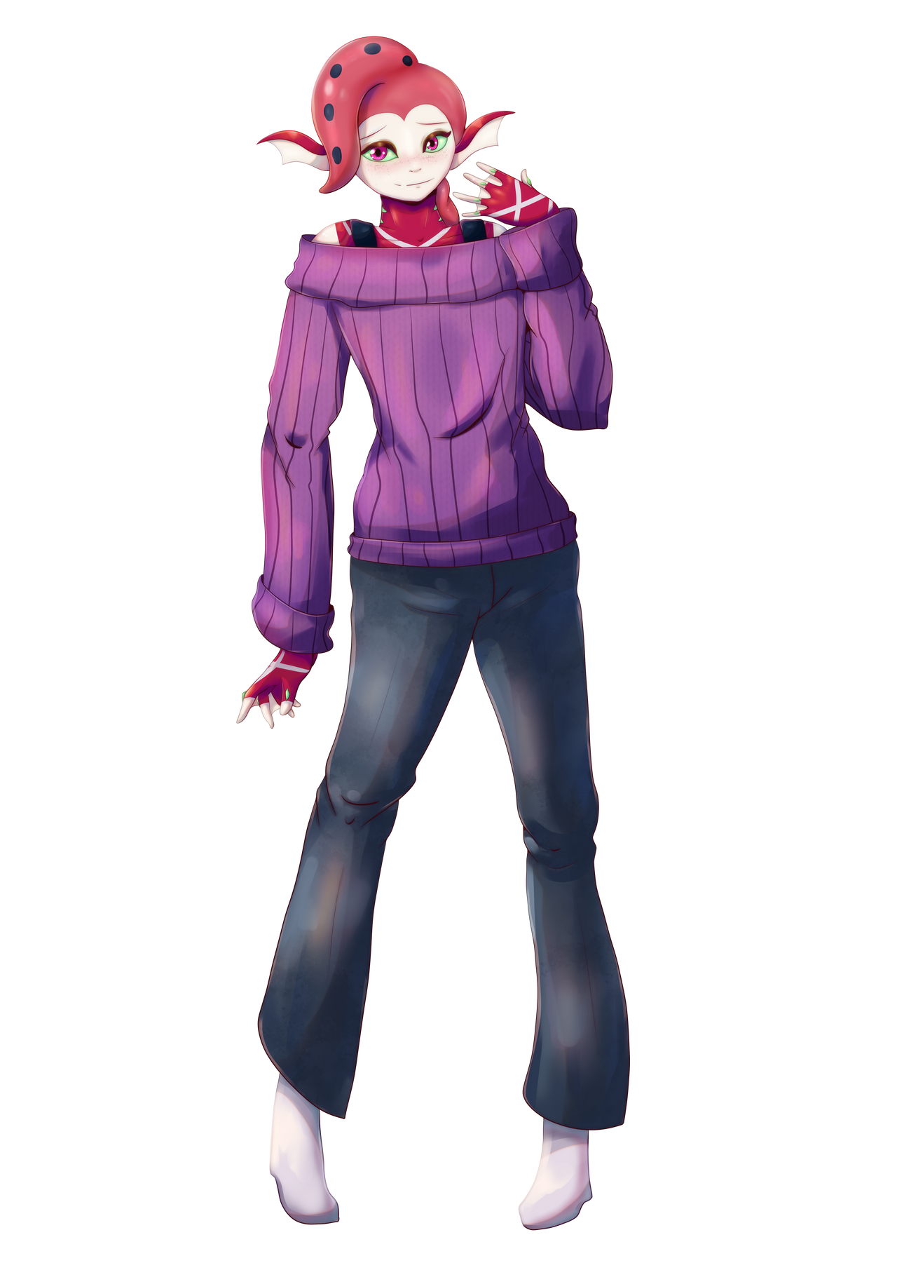 He was below-average height for a demon at under six feet tall, and was possessed of a youthful, elegant beauty. He wore snug-fitting blue jeans and a purple sweater over a black tank-top, the bands of which were visible through the wide v-neck of the sweater, exposing his toned chest. He preferred turtlenecks, but his boss insisted on a more exposing ensemble. His boss was the reason why he was sitting there at all. A low-level demon like him would otherwise have had to stand, but being in his boss’ service entitled him to certain benefits in travel and other areas.