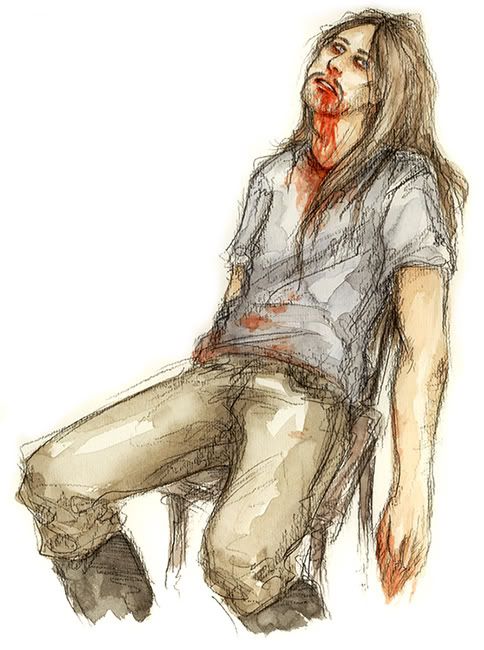 Skwisgaar approached slowly. His foot met with an empty whiskey bottle and sent the glass skidding along the floor.