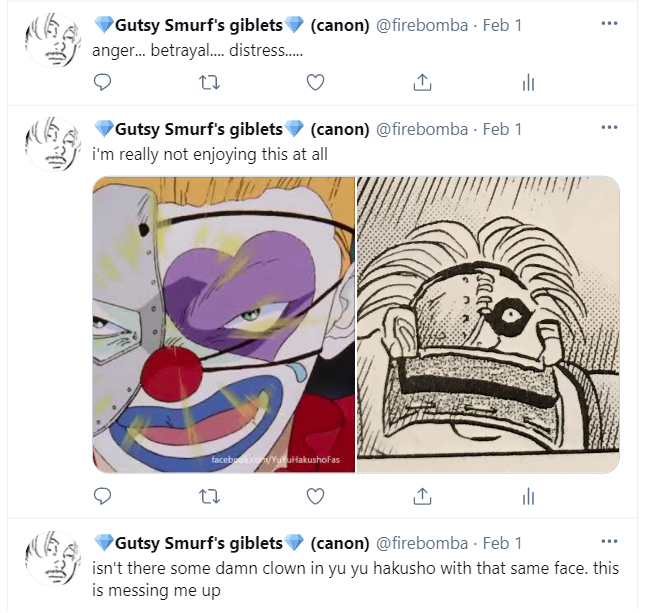 Right now, it looks like the stereotype character is going to be very background, and not necessarily Evil evil. But that design is more hateful than either Jakotsu or Suzaku's by an order of magnitude. Both Jakotsu and Suzaku are feminine, Jakotsu wears makeup, etc. They, however, have actual designs that aren't just "Whaaaaat?! Gross!!!" That cleft chin isn't an innocuous design choice, it's a deliberate signifier that This Character Is A Funny Freak. See this post (not by me) on Tumblr for some other stereotypical designs from anime more recent than Sailor Moon, Inuyasha, and early-period Naruto. The chin and the exaggerated makeup are a conscious decision to make this character a stereotype, a weirdo who doesn't quite have permission to wear makeup like normal people (cis women) do, but we'll allow it as long as he acts goofy. To me, the design recalls Bobby from Macross Frontier, which I haven't watched, but from his wiki entry he certainly seems like he was at least allowed to have a personality. Like those earlier gay/gnc characters, and most likely unlike this upcoming character in Yashahime.