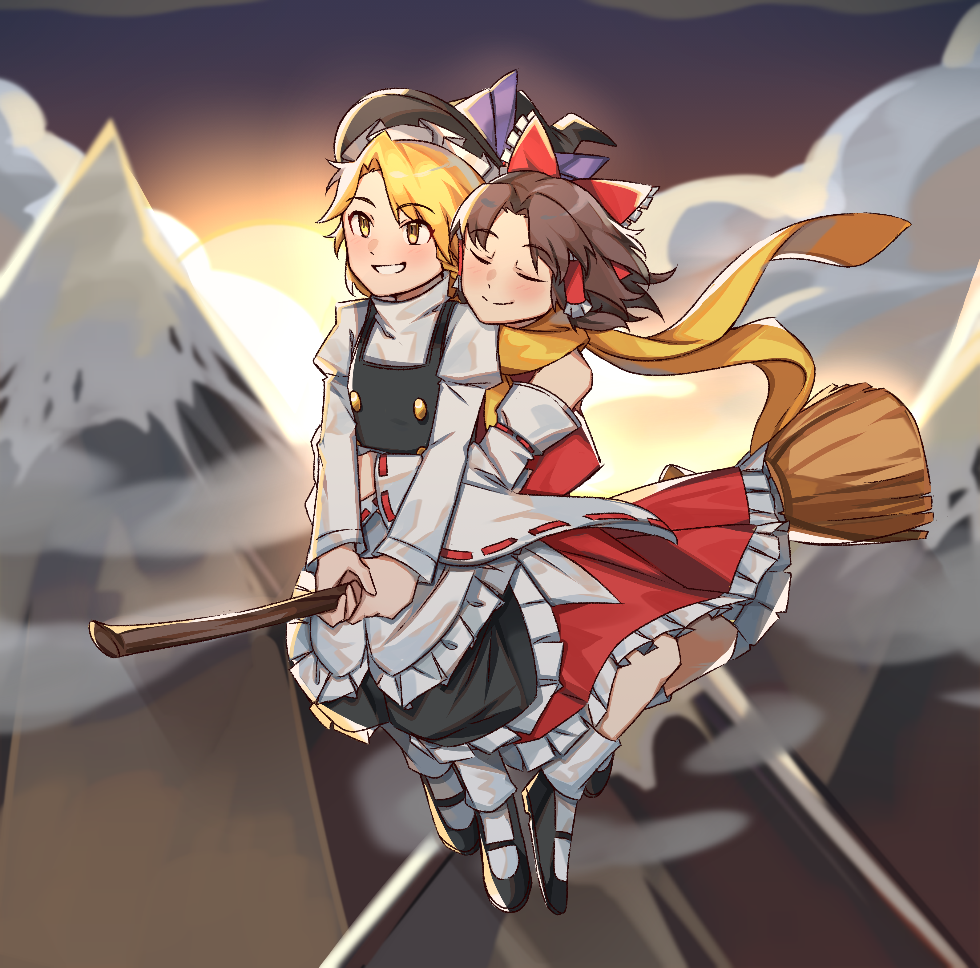 Reimu flies around and sits on the back of Marisa’s broom, wrapping her arms around her wife. “You idiot, you know I wouldn’t stop you. Anyway, it’s cold up here and I’m getting tired, so take us home.”
