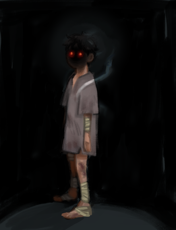 It was the same voice from before. He looked up in surprise to see a face hovering inches from his. To his vast surprise, it was the face of a kid. An actual kid, as in he looked between his early mid-teens. He had tan skin, black hair and huge dark eyes with a matching grin. He was covered in scrapes and bruises, some of them were sloppily bandaged.
