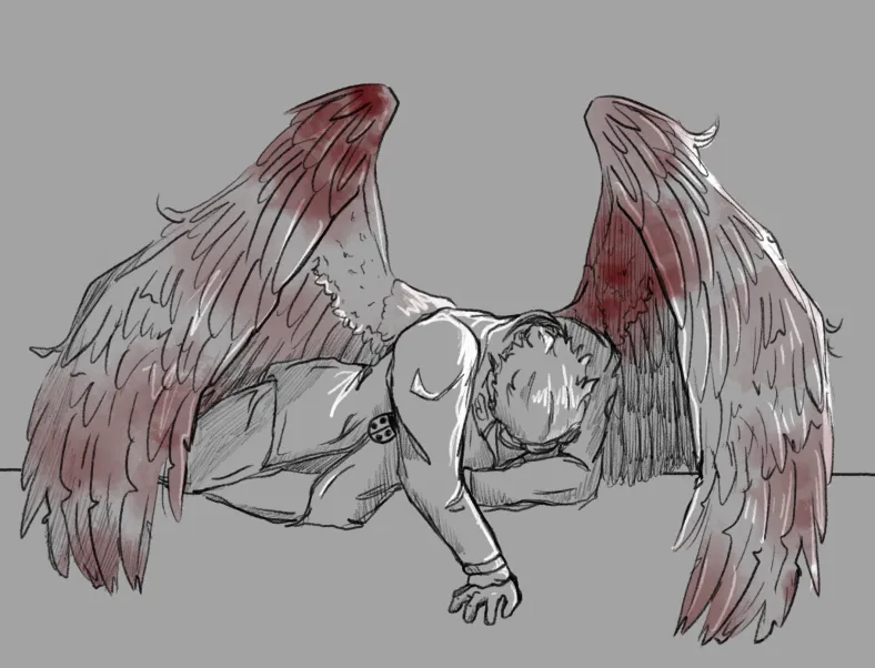 Every feather that snaps and breaks away takes a piece of him with them. His wings twinge and spasm uselessly, trying to break free and failing. An agonized cry claws its way out of his lungs at one point, scraping against his vocal cords.