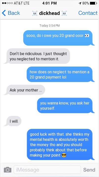 “Oh, I wonder why you didn’t get an invite. You’re such great company,” snaps Mom and stomps out of the room.