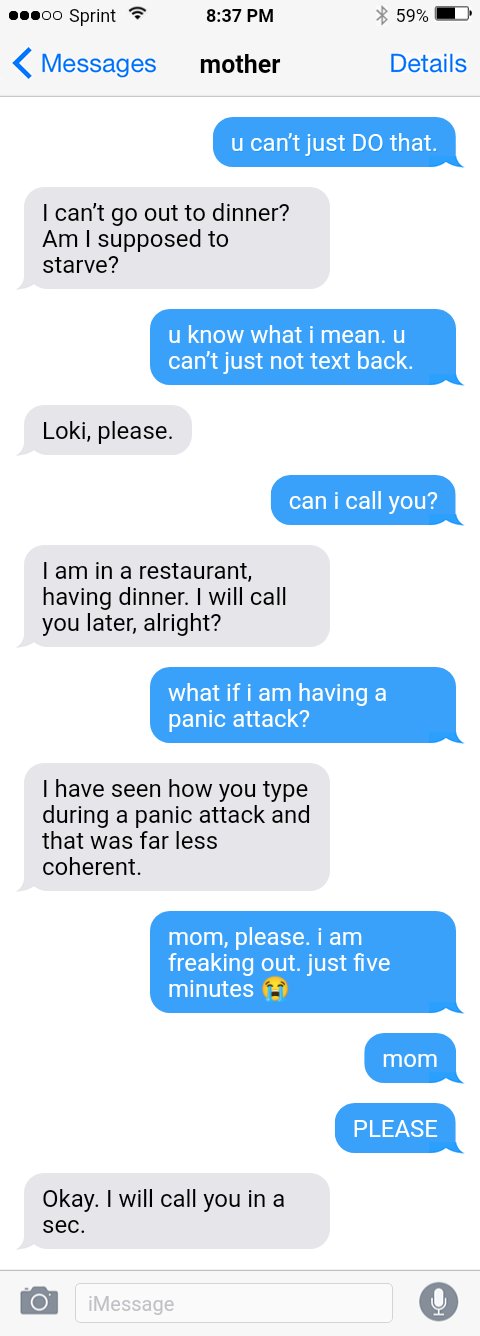Oookay, granted, explaining stuff to child alters is still hard sometimes. Before Thor can trawl though his brain for an acceptable answer, though, Leah whines and screws up her face.