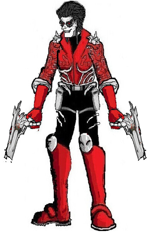 Landing his vehicle, the man in red carefully checked the gauge on the screen. He should have enough fuel cells for a week or two. Looking up, he scanned his surroundings, then froze as he saw the target's own - a black motorcycle with a skull placed right in front of the handlebars, with turbines and thrusters at the sides.