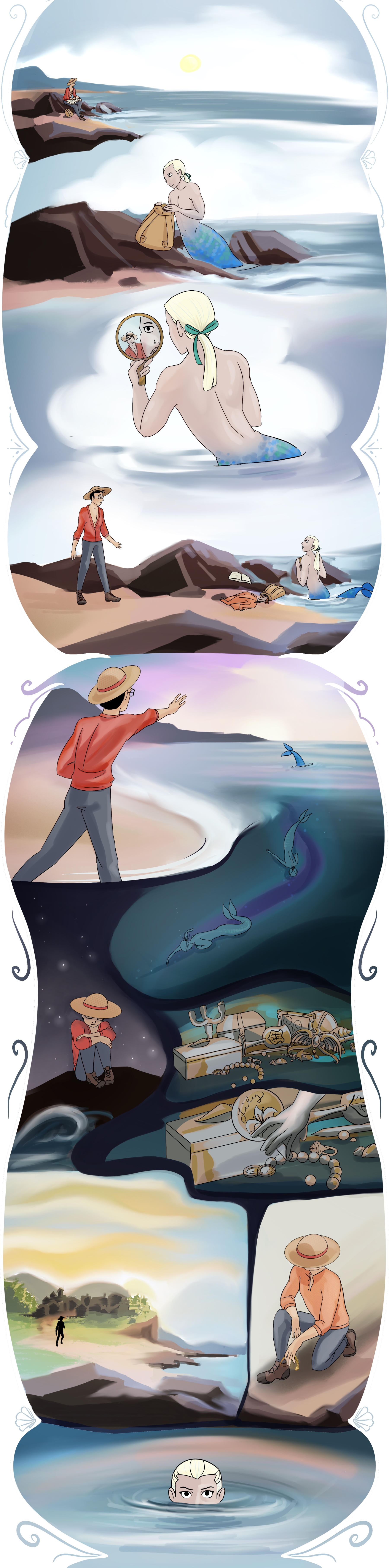 Merfolk researcher Harry Potter has been looking for signs of merfolk along the coast, and a very handsome merman has been watching him from afar. (A short, silent comic with Little Mermaid vibes.)