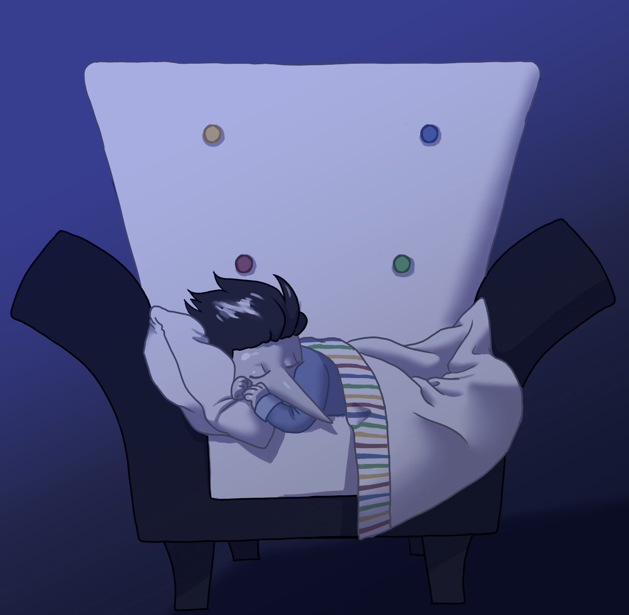 “I love you too, Spamton. Sweet dreams.” Swatch offers just as affectionately, giving Spamton a peck on the head before turning off the light. the small puppet closes his eyes, his body practically melting as he falls asleep to the loud and slow heartbeat of his brand new partner.