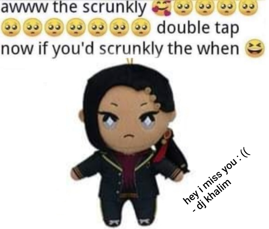 [Description: The attached photo is of a scrunkly Jamil nui, with the caption "awww the scrunkly 🥰🥺🥺🥺🥺🥺🥺🥺🥺🥺🥺🥺🥺double tap now if you'd scrunkly the when 😆," alongside a typed message of "I miss you :((( -Dj Khalim." As funny as that is, however, the photo might not be viewable because what the fuck, AO3.]