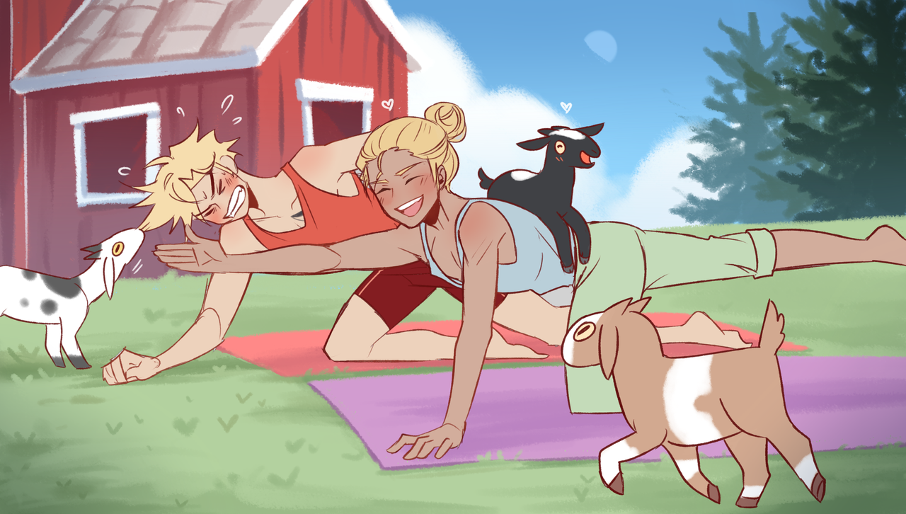 Before the upbeat music could start blaring, Grill waved his arms, warding it off, shouting, “Oh no you don’t! You are NOT going to ruin our date with your weird little facts—” Grill trailed off into horrified silence, staring blankly at the website in front of him. A tiny tan-and-white goat stood balanced cheekily on the back of a smiling woman who blissfully held a yoga pose.