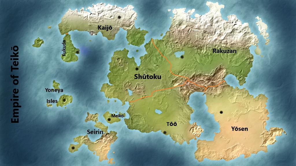 NOTE: The map here depicts the fictional world “replacing” the Elemental Nations of Avatar. Since these are snippets, in some cases, Kaijō and Rakuzan, for example, may NOT “stand for” the Water Tribes — they may represent other elements/Nation. However, the current markings do show, that Yōsen for example, is like the Earth Kingdom and Kaijō is like the Water Tribe.