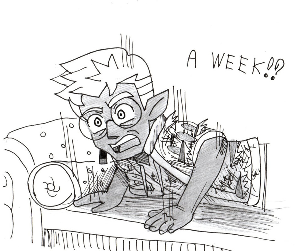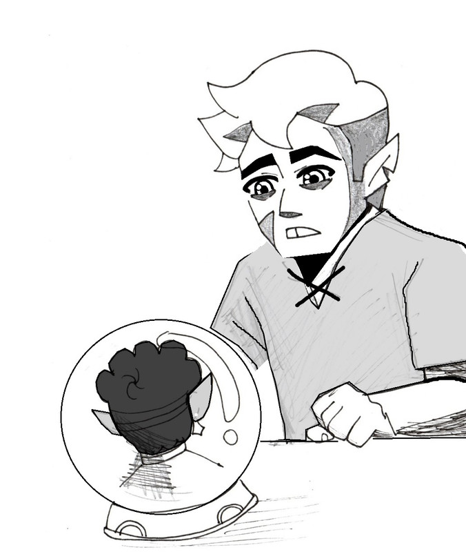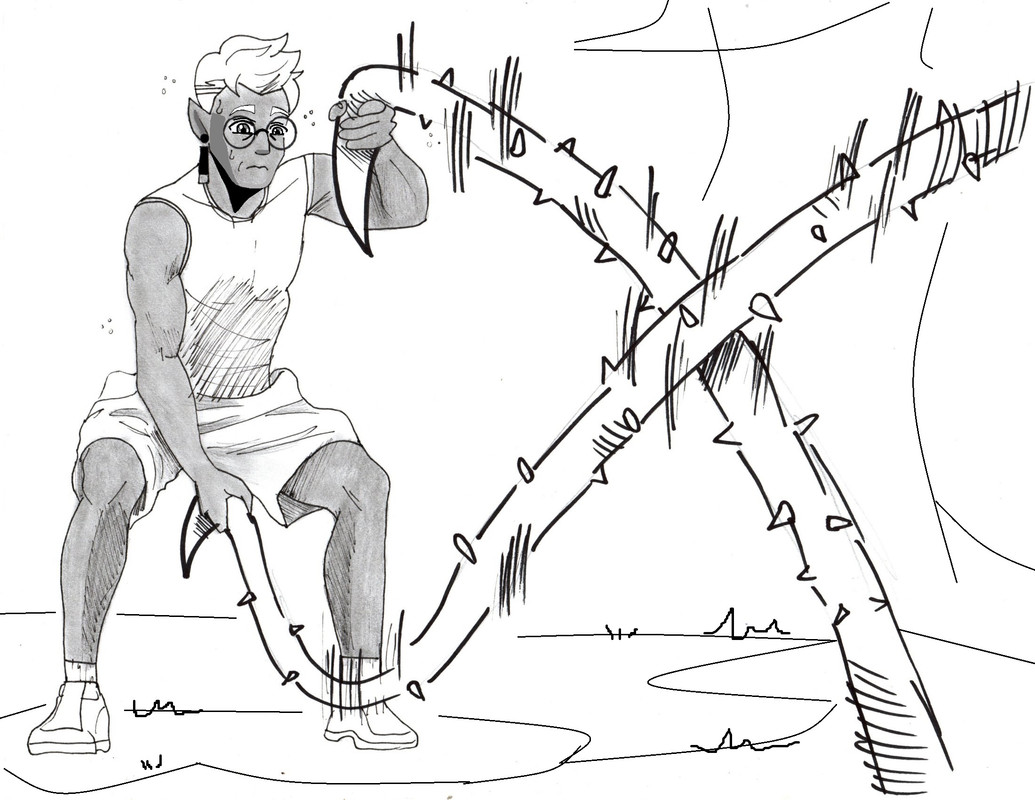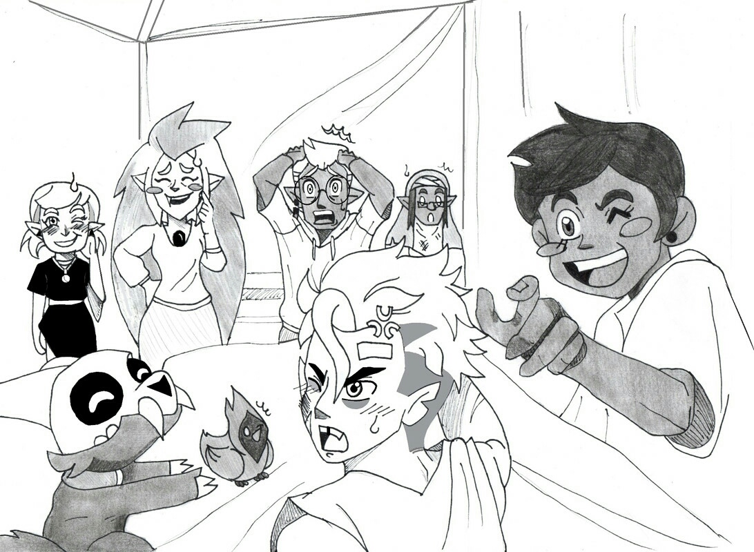 Raine places some birdseed on Hunter's chest for Flapjack to nibble on and they exit the tent briefly to gather two thin branches of palistrom wood with the Bat Queen's permission. They grab a small knife, and sit back down on the uncomfortable folding chair beside Hunter’s bed and begin to whittle.