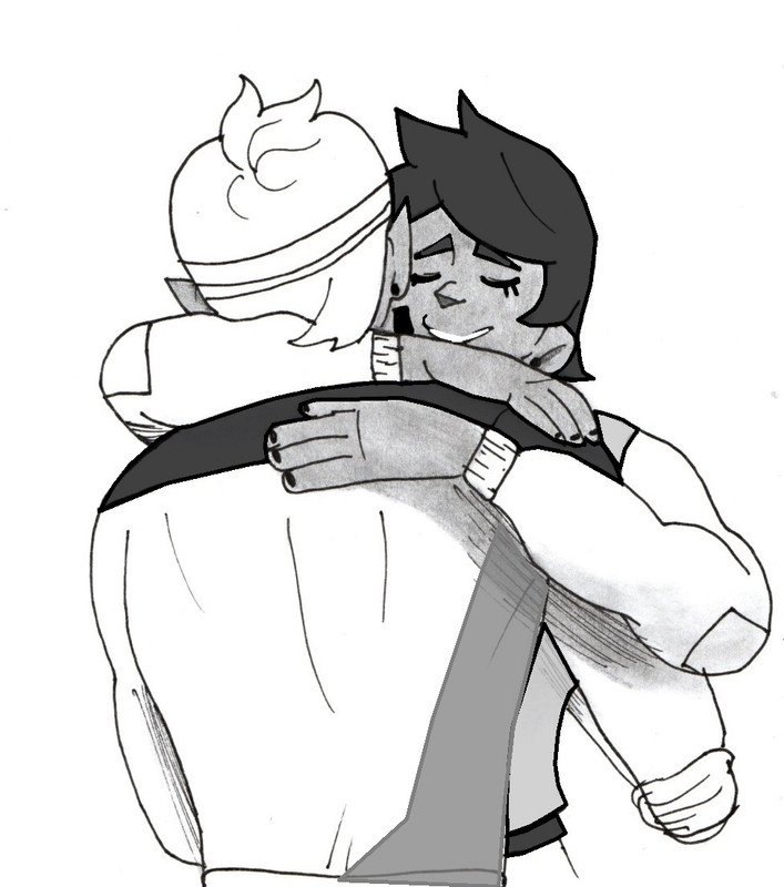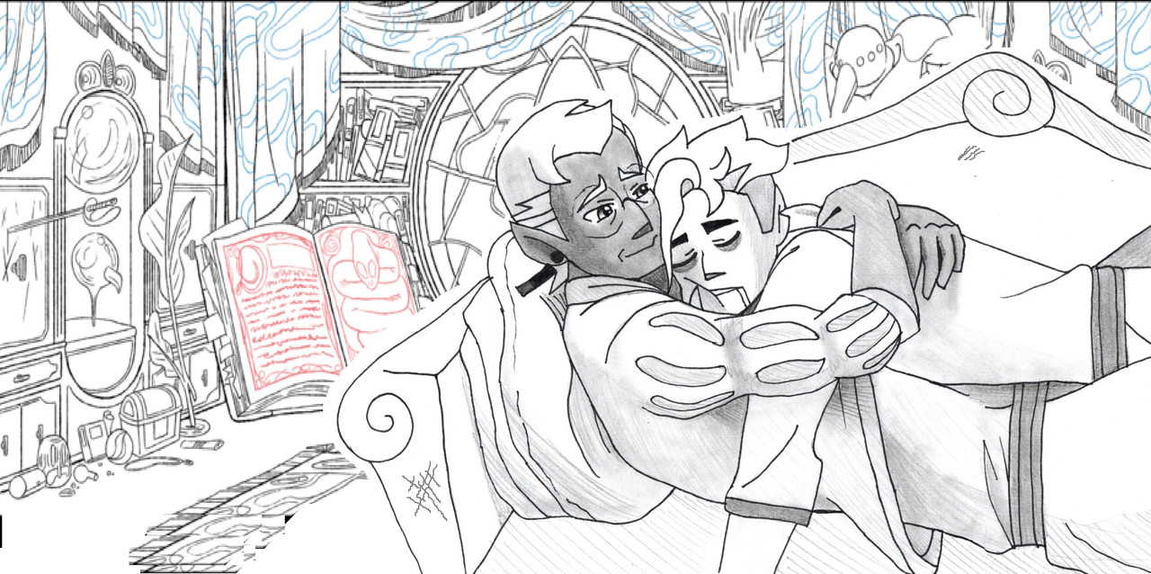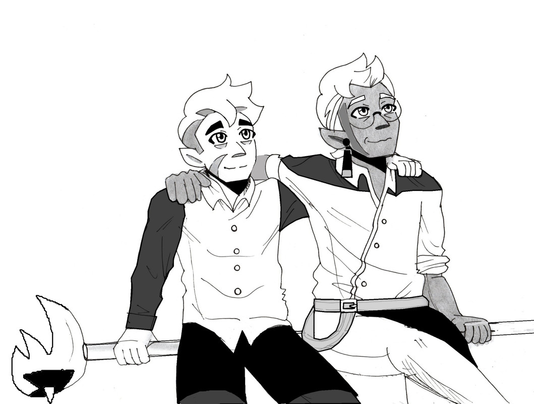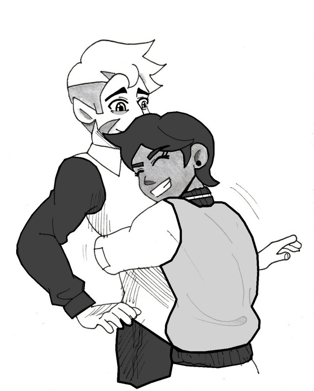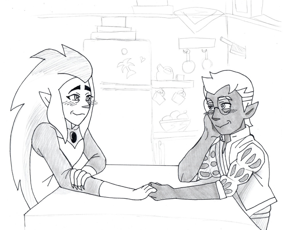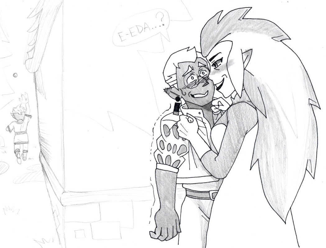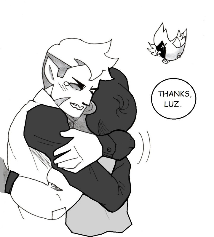 Raine blushes slightly when Eda leans over their back and hugs them from behind, “You took off your vest?” Eda asks, unsure what to say.