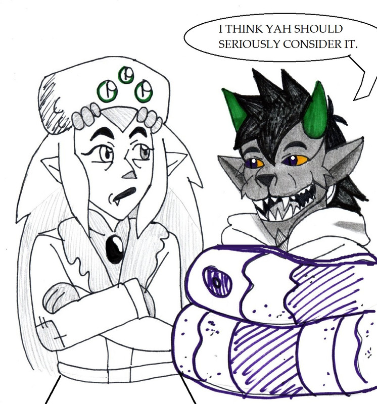 Raine rolls some of their sleeve fabric between their fingers and then exhales and leans back in their chair, “Alright,” Raine concedes, “at some point, we can implement your plan.”