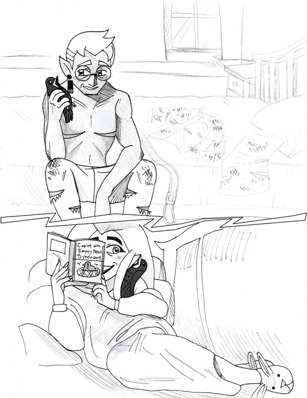 “Yes, dad? Yeah, I’ll be home in a little bit. I was just checking on my friend in the healing ward. Okay, sigh, I’m heading home now. See you soon.”