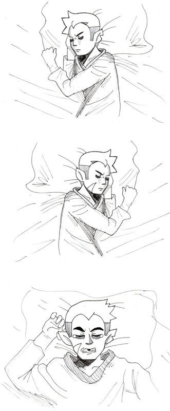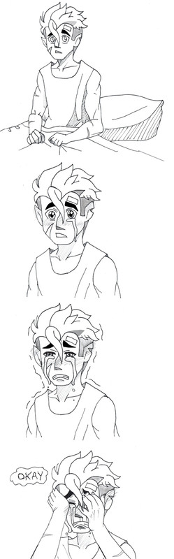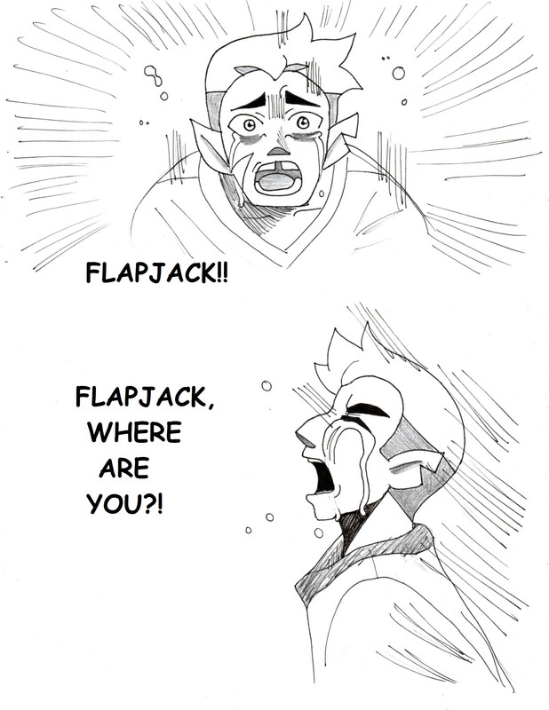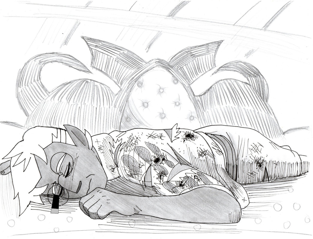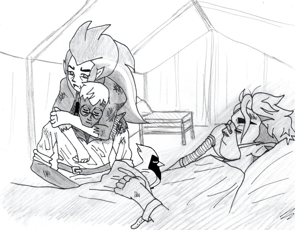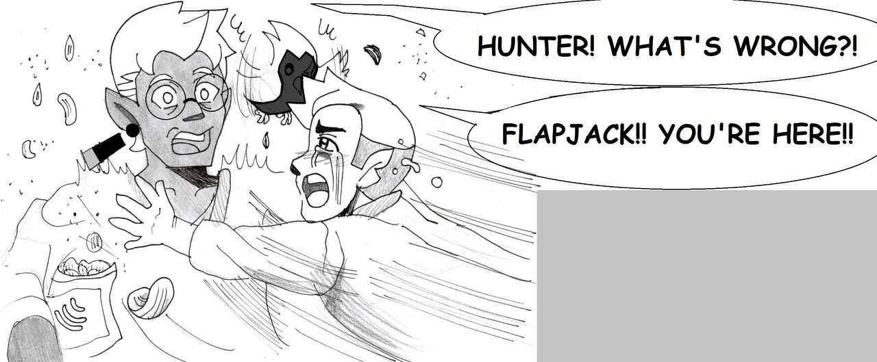 Raine replaces the damp cloth on Hunter's forehead, while Flapjack rests atop Hunter's chest that steadily rises and falls. Although Hunter is finally in a quiet and comfortable environment, his fever has yet to break.