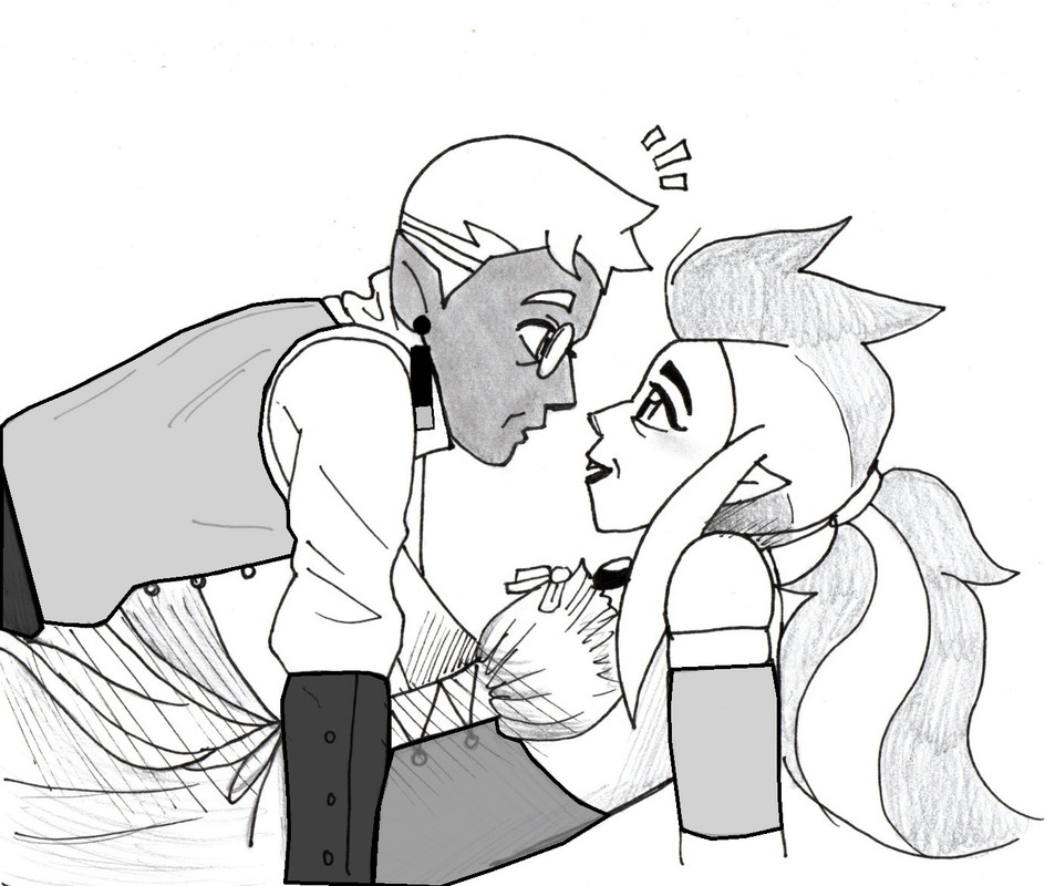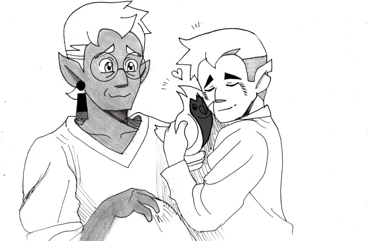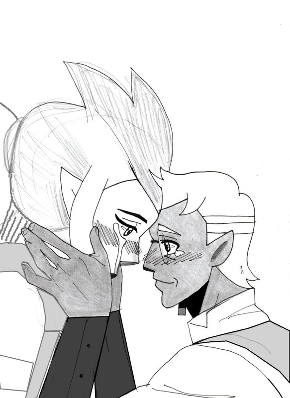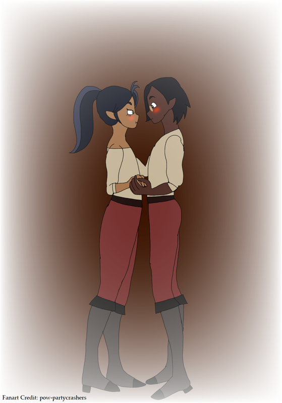 Eda reaches forward and clasps her hands around Raine’s tenderly. Eda takes the flower they had been twirling nervously and puts it behind Raine’s ear.