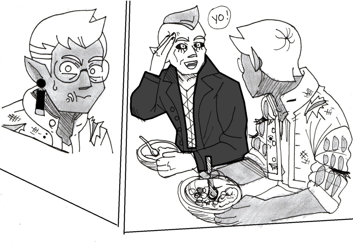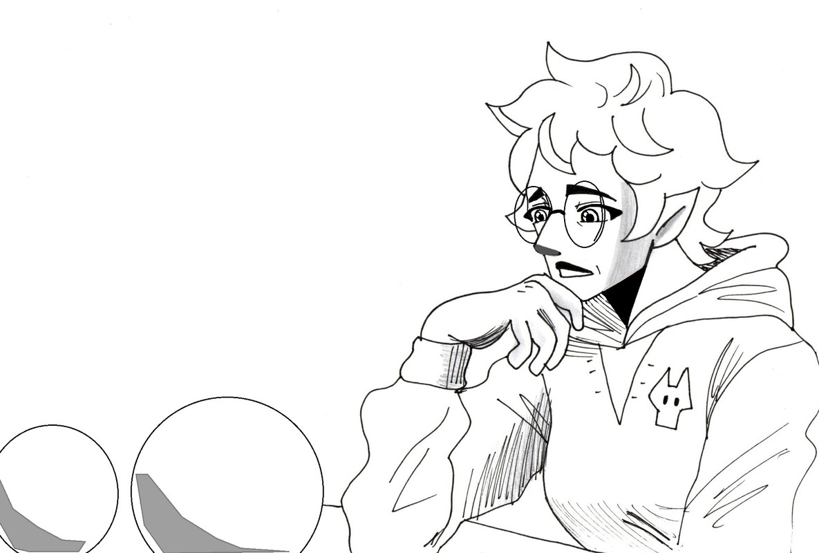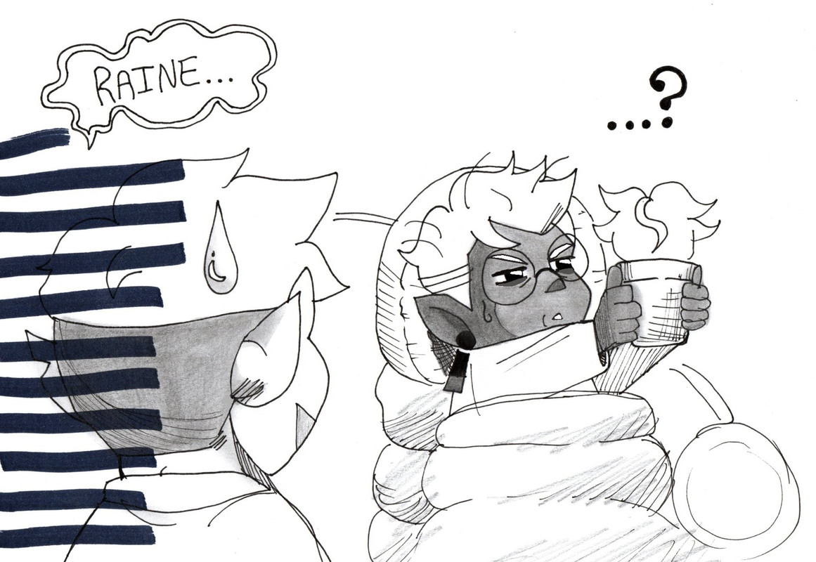 “Hmm, I guess that could work…,” Raine grumbles, their arms crossed resting on the tabletop and staring down at their cup.