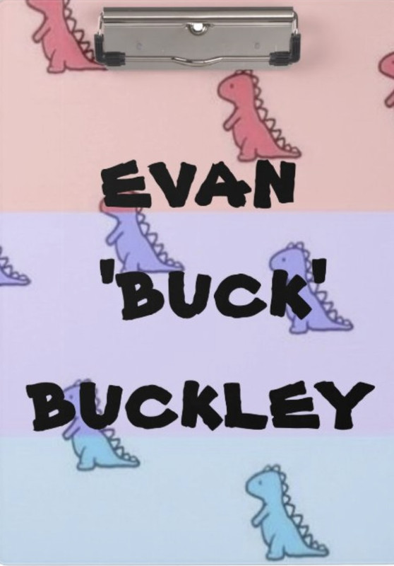 Buck nodded, bringing the clipboard up to study it more closely. His full name was in black lettering in the middle of the board, his nickname front and center. The background was pink, purple, and blue, little dinosaurs in the same color scheme spattered across it. It was the same color as the bisexual flag, Buck’s heart skipping a little for it. He’d known he was bisexual for years, had never really tried to hide it, though he’d only formally informed his teammates in the recent years, all of them being supportive, especially Eddie.