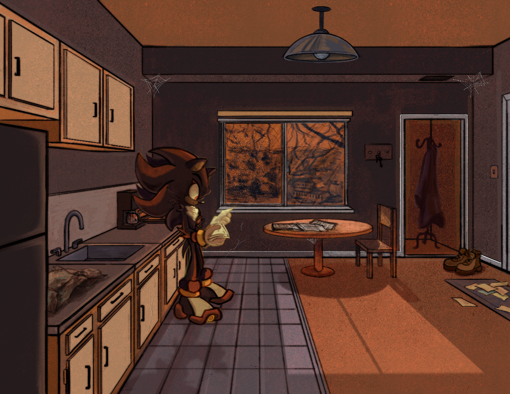 That was all Shadow had needed. With one final breath, the mask of apathy firmly affixed itself back onto his face, hiding it in the same manner the darkness did, the room now shrouded in pitch black. As if nothing had happened at all, Shadow stepped out of the kitchen and down the hall.