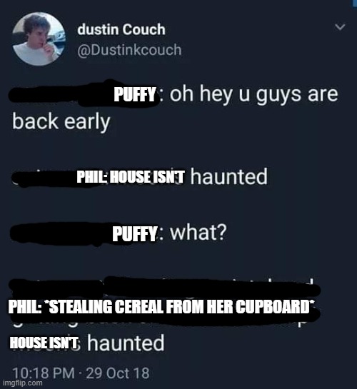 “Hmm,” Puffy said with the ghost of a smile. “I’ve heard that too. That’d be odd considering the family didn’t even die in the house.”