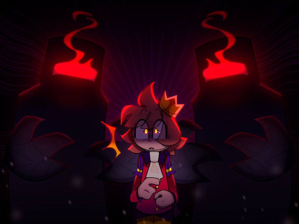 The aforementioned royal cupped his hands together pleasantly, brown and caramel colored hair framed his face as he smiled happily at them. His crown seemed to share the smile as it twinkled in the light. “Hello!” He said simply, giving a canine showing grin.