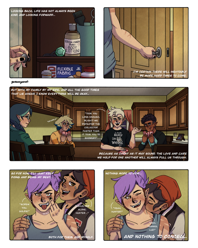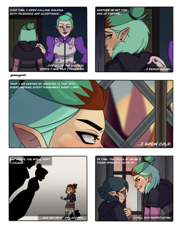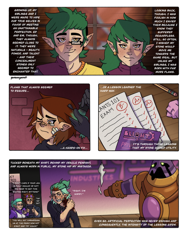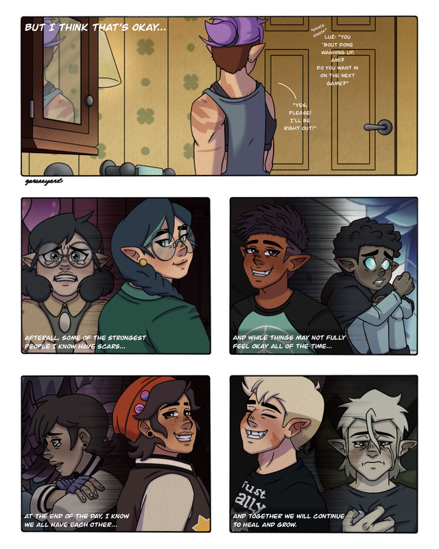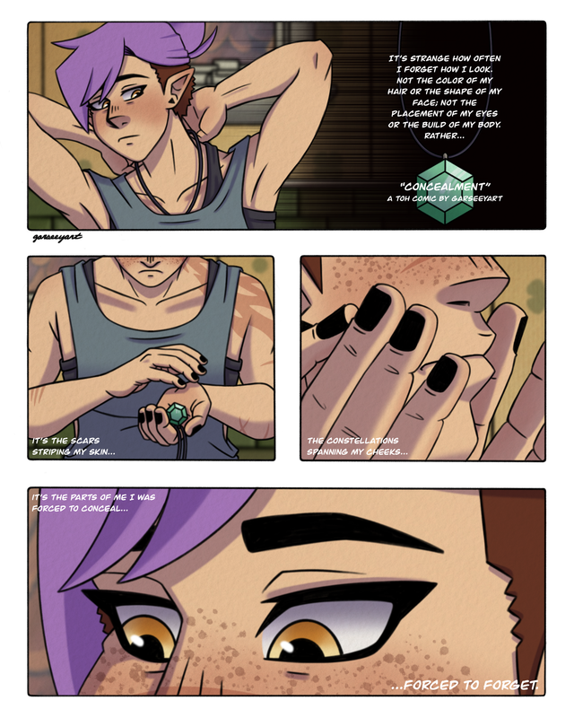 A comic based on a head canon I have that when Amity isn’t wearing one of them concealment stones, you can see scars she’s accumulated over the years from various “accidents” demoing at her parent’s weapons showcase during punishment.