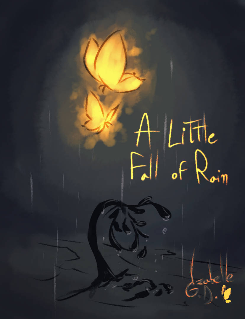 The ground, too, was stained with crimson; not from the fading sunset, however. It spread across the grass and dirt with each raindrop that fell on the small puddle that formed on the rocks, slowly diluting in the water.