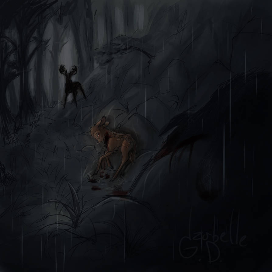 A few meters away from the dog's lifeless form was a fawn struggling to stay conscious, trying his hardest to walk away; his fur was soaked in rain, his neck and throat were soaked in... blood.